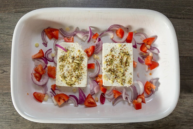 - Place feta blocks in an oven-safe baking dish.