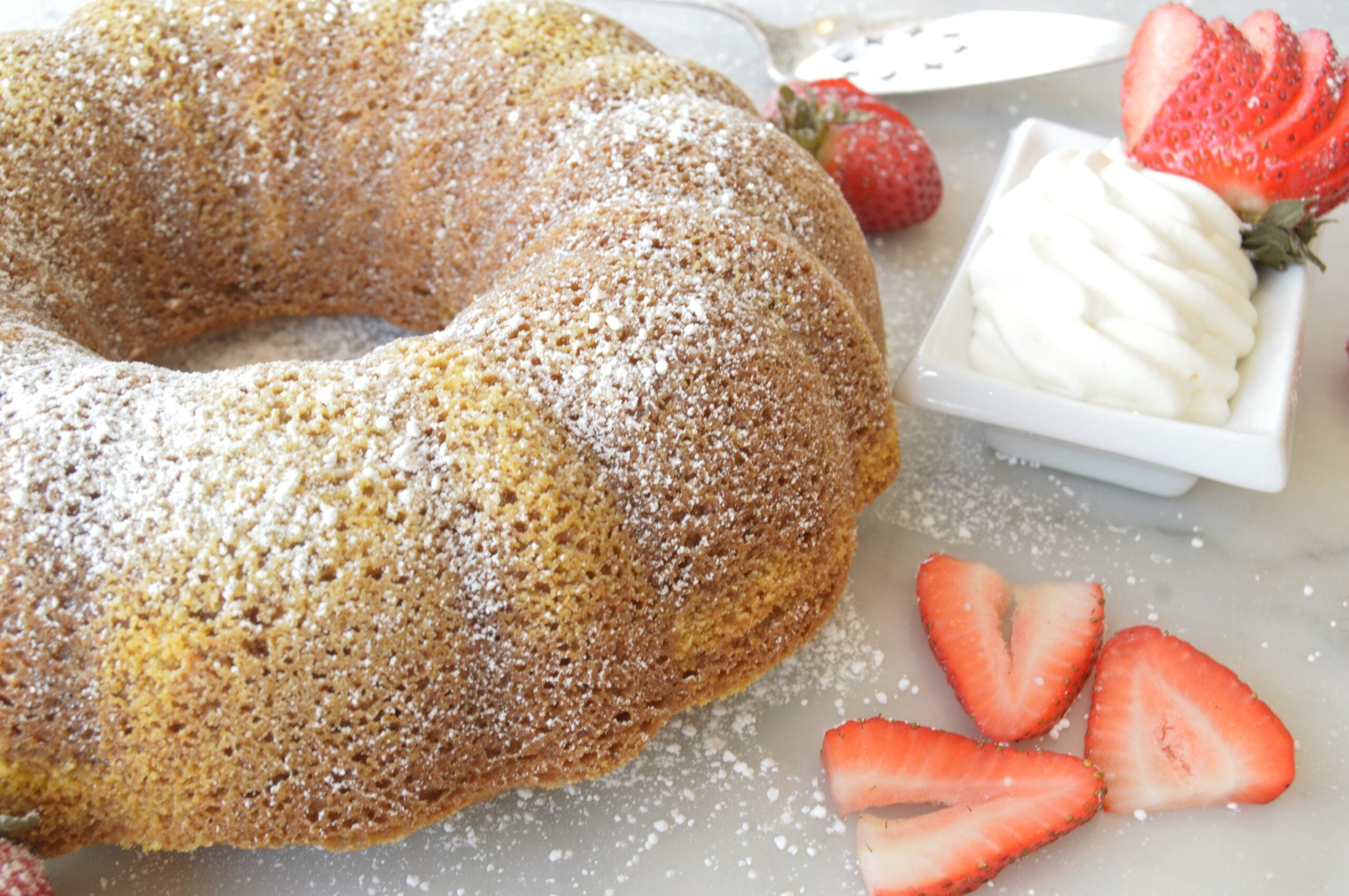 Preheat oven to 350 degrees. Smear 1 tablespoon butter over bottom and side of a 12-cup bundt or tube pan. Sprinkle 2 tablespoons cornmeal evenly in pan. Tap pan over sink to remove excess.