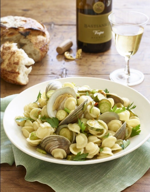 2. Add the white wine and bring to a simmer. Add the clams and scallions, stir, and cover the pot. Begin cooking the pasta in the boiling water. Cook the clams until they all open, about 5 to 6 minutes, discarding any that do not open. Uncover, and increase the heat to high to reduce and concentrate the sauce while the pasta finishes cooking.