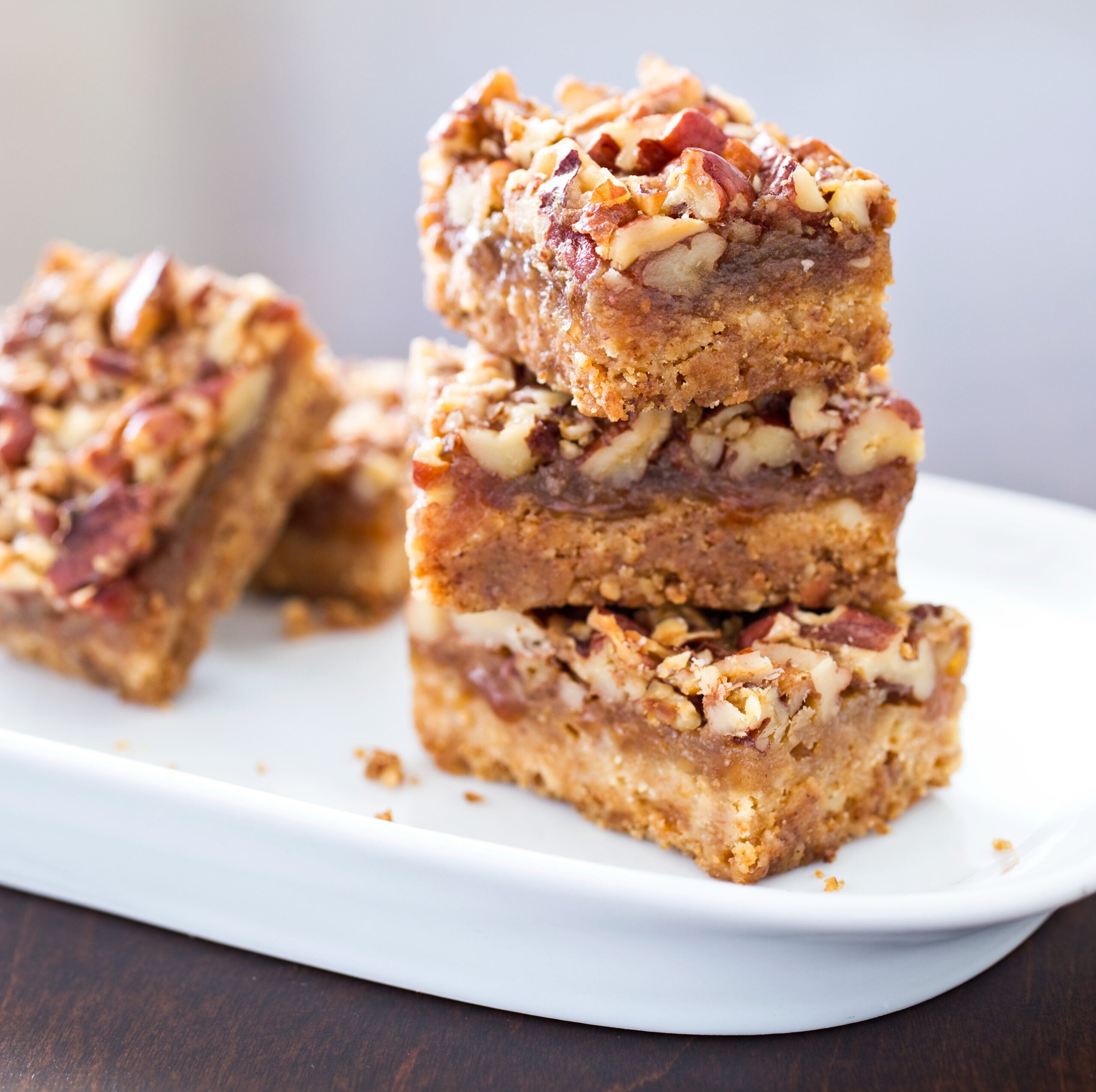 For pecan bars with all the best attributes of pecan pie — buttery crust, gooey filling, and nutty topping — we cut back on both wet and dry ingredients for the perfect balance of sweetness and gooeyness. We load the bars with pecans, adding ground nuts to the crust to give an extra boost of rich pecan flavor to our recipe. Hints of vanilla extract and bourbon keep the filling from being cloying and complement the pecans. Because of their high sugar content, pecan bars store well and taste great up to five days after baking.