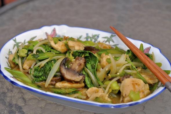 - Increase heat to medium-high. Add the remaining 1 tablespoon oil, onion, bell pepper, sprouts, water chestnuts, bamboo shoots, and ginger and cook for 3 minutes. Pour in the broth mixture and bring to a boil.