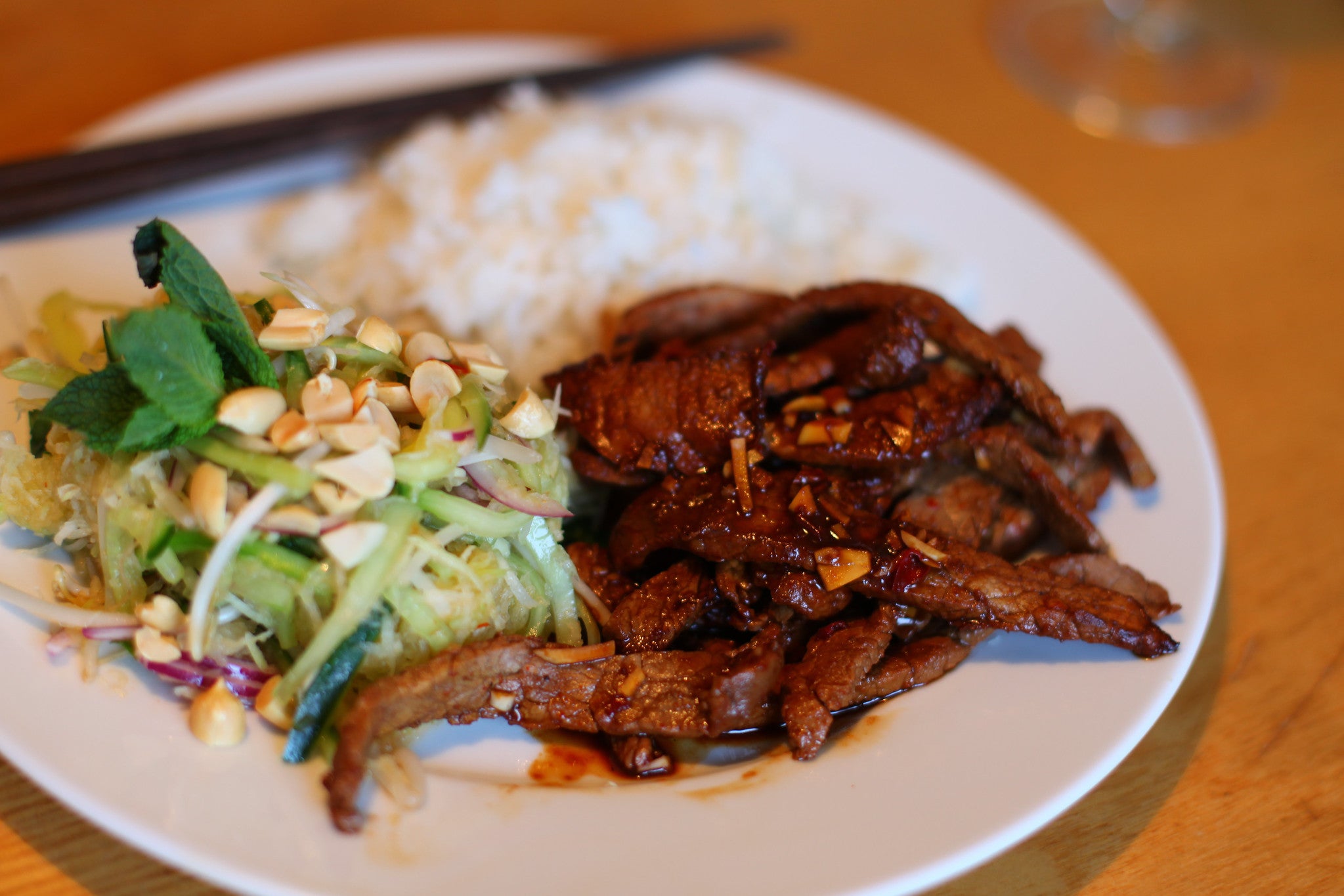 - 8 oz Deli-sliced roast beef, cut into ½ inch strips