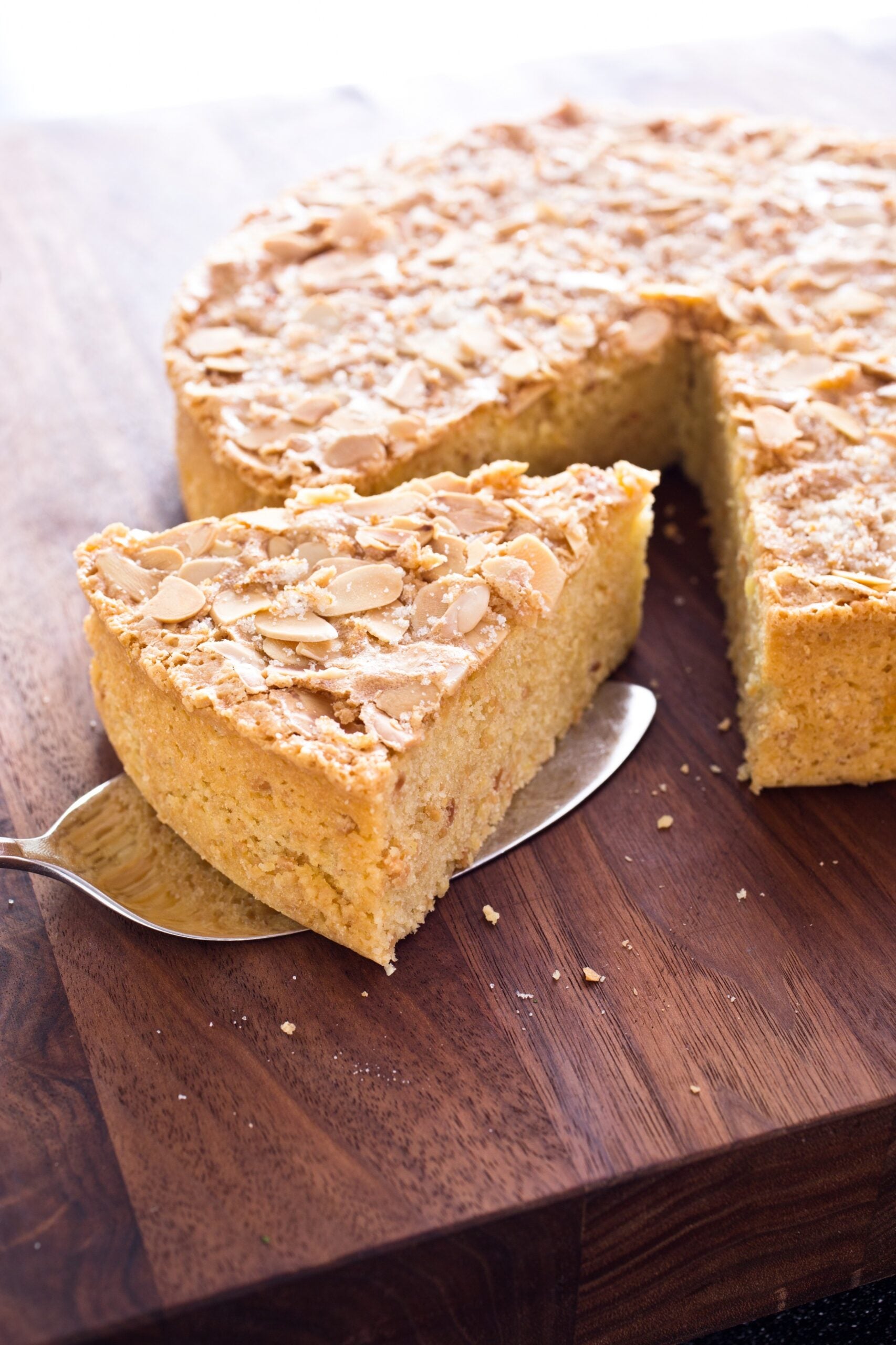 If you can’t find blanched sliced almonds, grind slivered almonds for the batter and use unblanched sliced almonds for the topping.