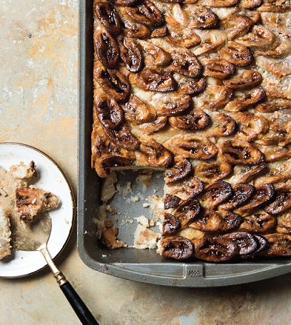- Line the bottom of a 12 x 8-inch baking pan with a single layer of the soaked bread slices. Top with a layer of marinated banana slices. Repeat the process with all of the bread and banana slices, ending with banana on top. Bake for 1 hour. To test for doneness, insert a toothpick into the center of the cake; it’s ready when the toothpick comes out clean.