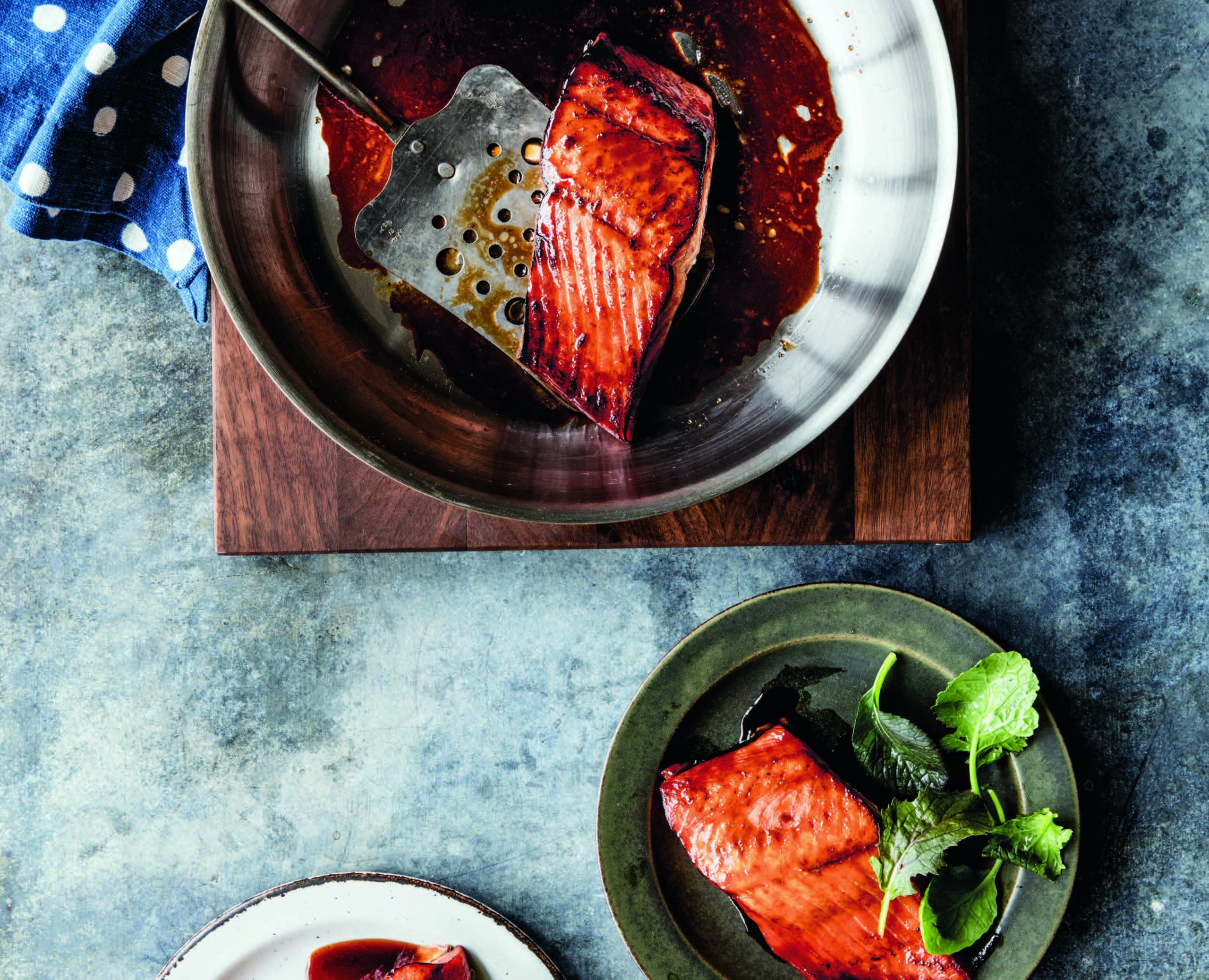 Pour the reserved marinade over the salmon fillets and gently shake the pan to distribute the sauce evenly. Cook until the sauce is reduced to a syrup and the salmon is dark brown, 1 to 2 minutes longer.