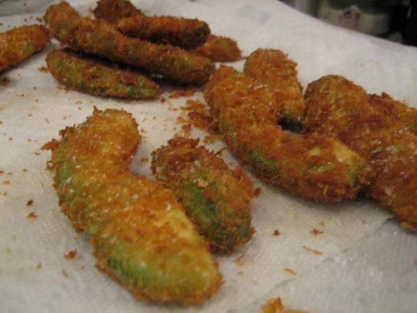 2. In another bowl, whisk 1 egg. Cut 2 peeled avocados into 16 wedges, dip wedges in egg, press into breadcrumb mixture and transfer to a baking sheet.