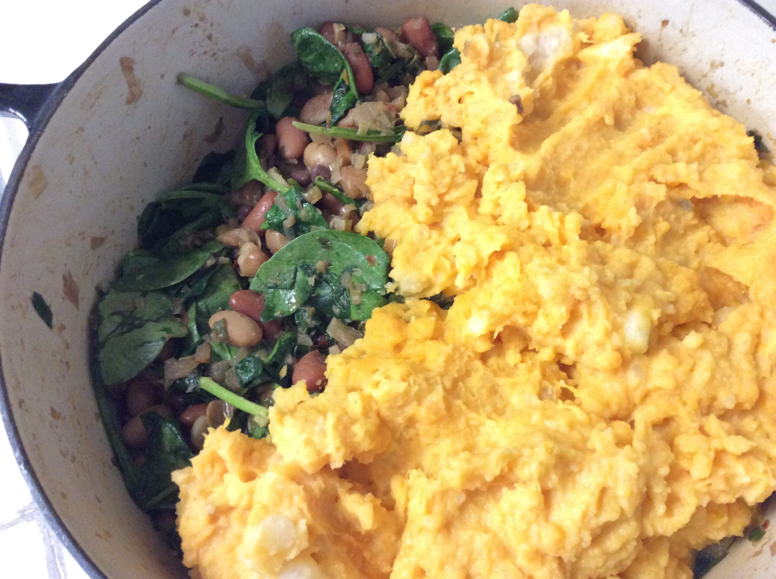4. Add the spinach and stir gently for two minutes, so that it begins to wilt slightly. Add the beans and stir gently for 1 minute more. Remove from heat, add more salt and pepper if needed, then spoon the mashed potatoes over the top. Sprinkle over 1 C. Parmesan, transfer to oven, and bake for 20-25 minutes, or until golden brown and just beginning to bubble at the sides.