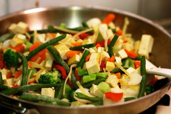 - In a large skillet, heat 3 teaspoons canola oil over medium-high heat. Add tofu to skillet. Cook 3 minutes without stirring or until tofu begins to brown. Using a spatula, stir tofu and cook 3 minutes more. Remove tofu from skillet; keep warm.