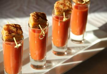 - Pour the soup into 18 heatproof 2-ounce appetizer-size glasses or small cups. Place the cheese sandwich skewer on top of the rim.