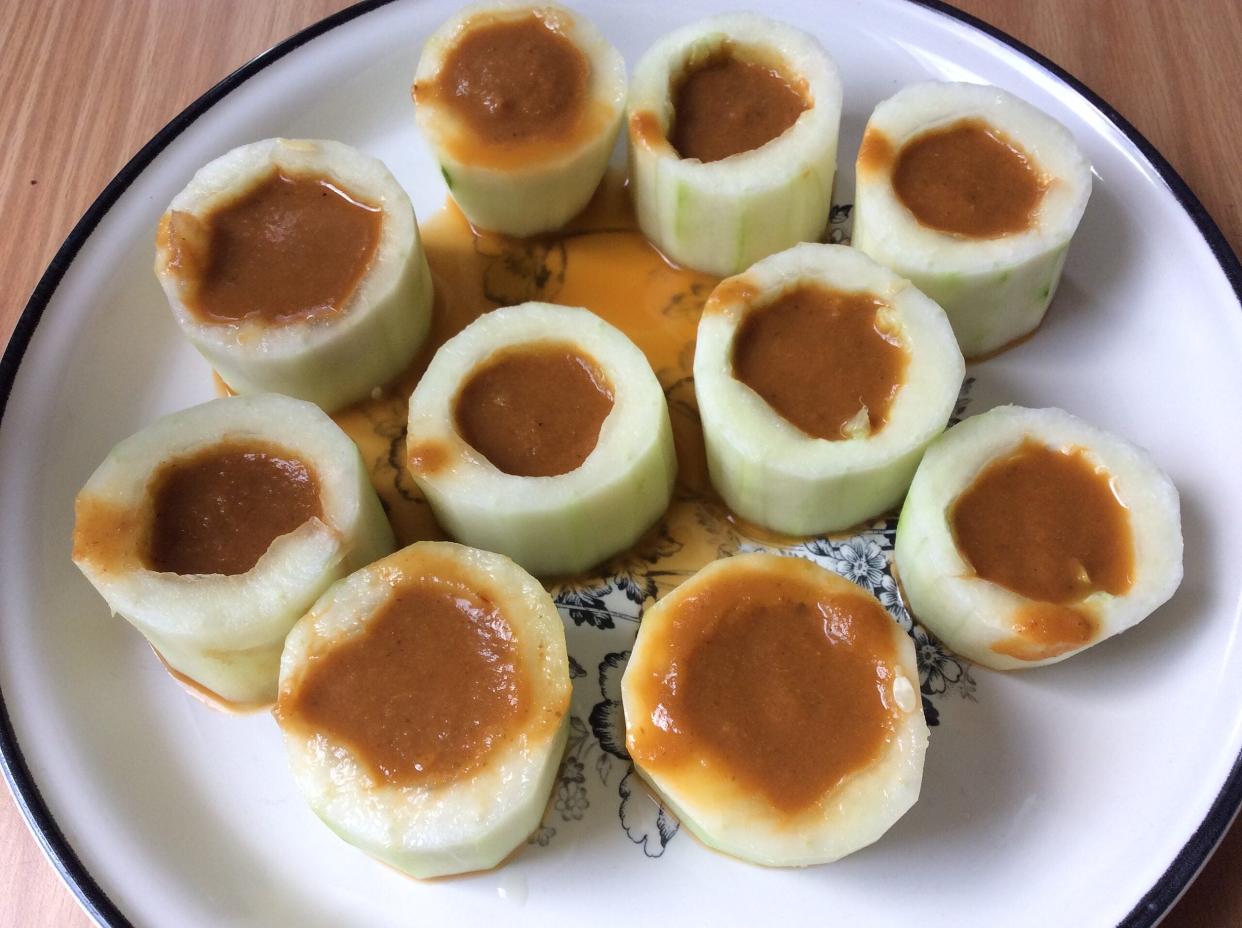5. To serve, peel cucumbers, cut into slices approx. 2 inches thick, then use a melon baller or small spoon to scoop out seeds three-quarters of the way through the slice, so that each cucumber slice looks like a veggie shot glass. Spoon soup into each cucumber slice. Sip (or knock back) the soup, then eat the cucumber.