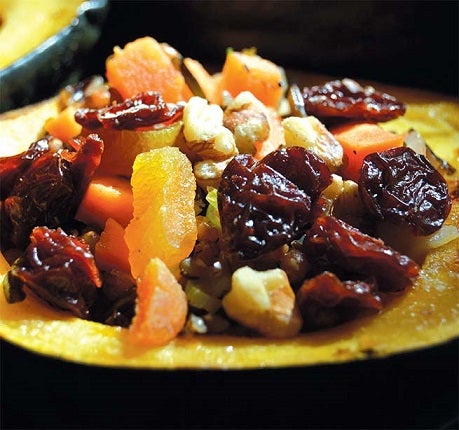 - Remove from the oven but keep them on the baking sheet pan. Divide the grain mixture among the four squash halves. Place back in the oven and roast for another 15 to 20 minutes to heat through and finish roasting the squash.