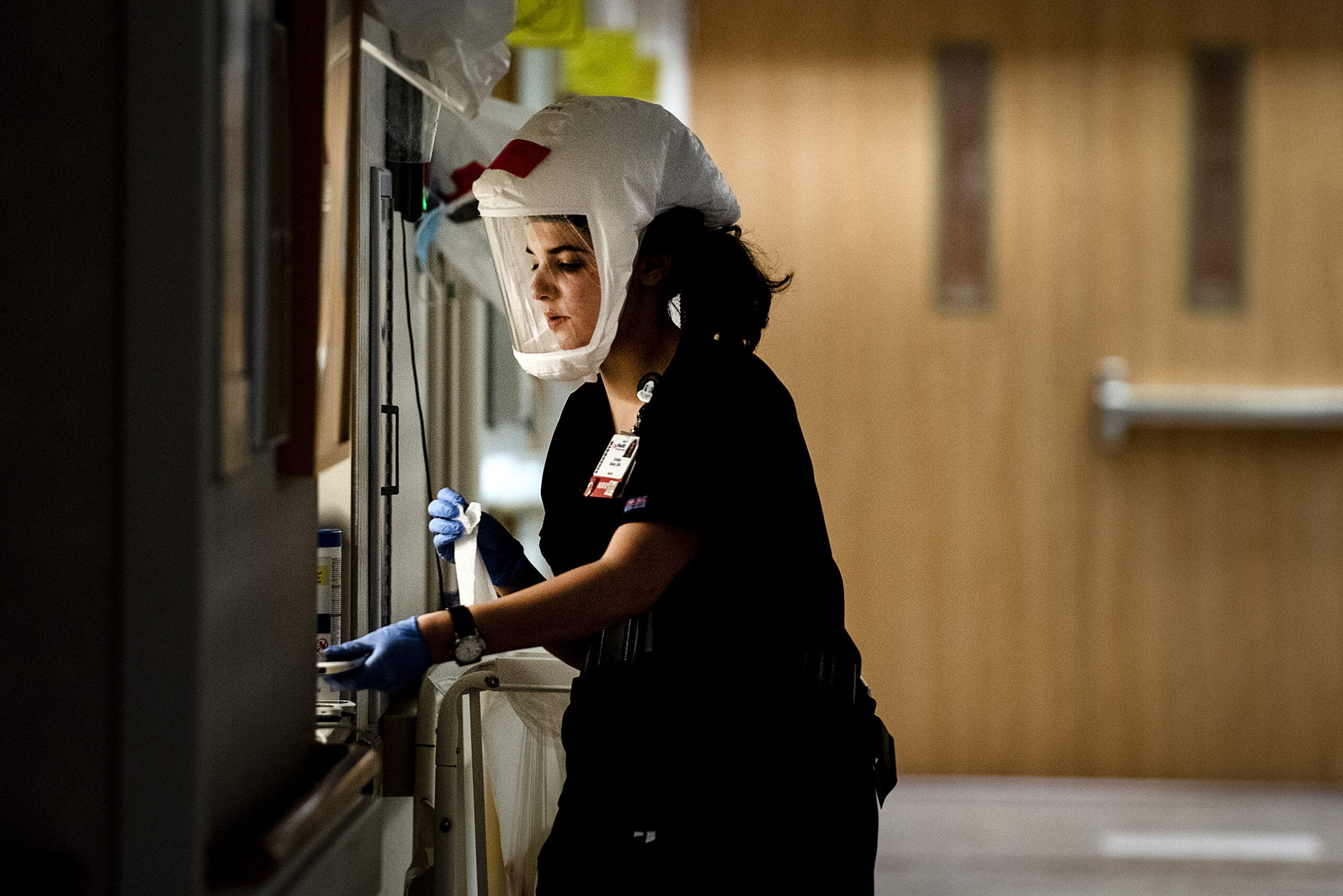 Medical staff walking the halls wear surgical masks. They suit up in full protective gear before entering each patient’s rooms: gown, gloves and facial protection. Lowe recently transitioned from using an N95 mask and face shield to wearing an air-purifying respirator called a PAPR. It resembles a soft astronaut’s helmet, and a tube connects to an air filter that a belt holds in place at her waist. Lowe likes that a PAPR allows patients to see her face. They know when she’s smiling, and hard-of-hearing patients can read her lips.