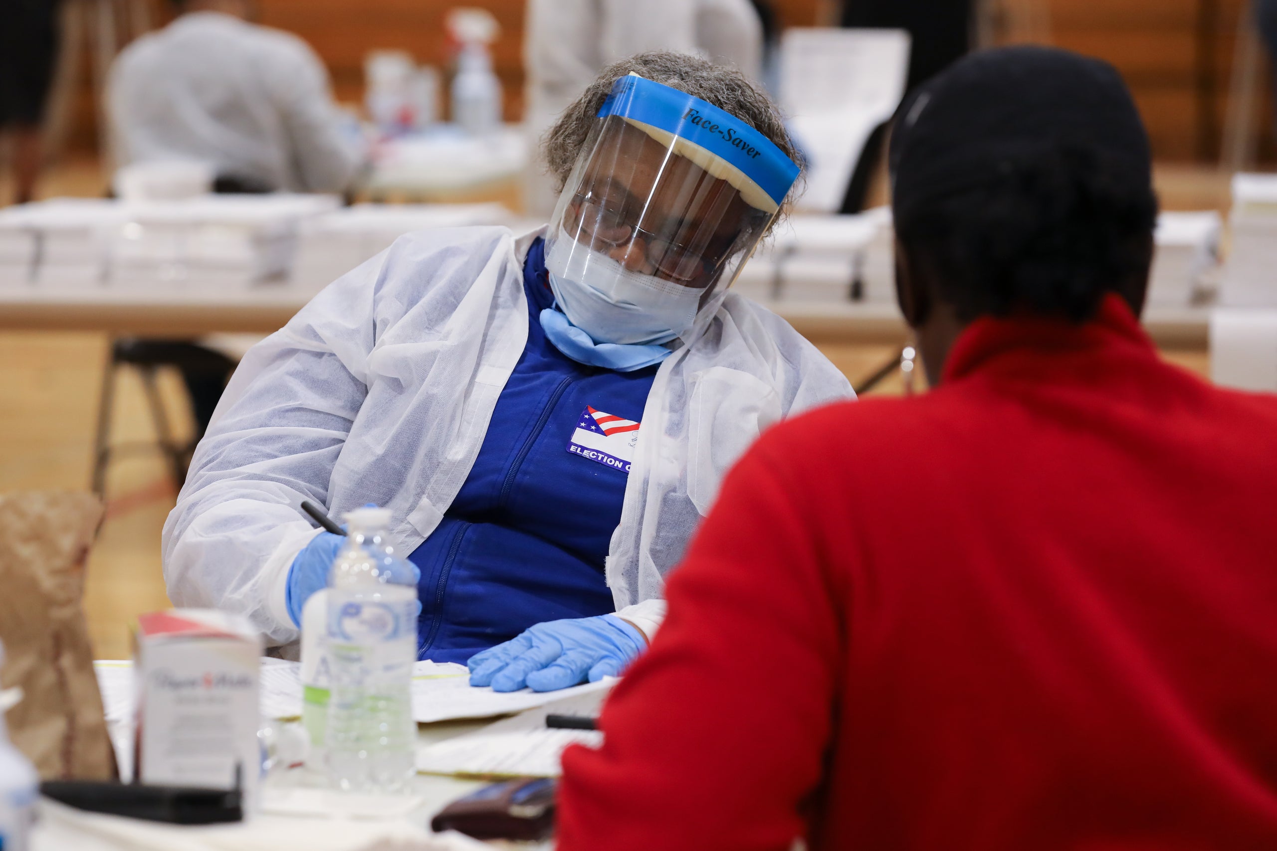 A poll worker wearing protective gear assists a voter