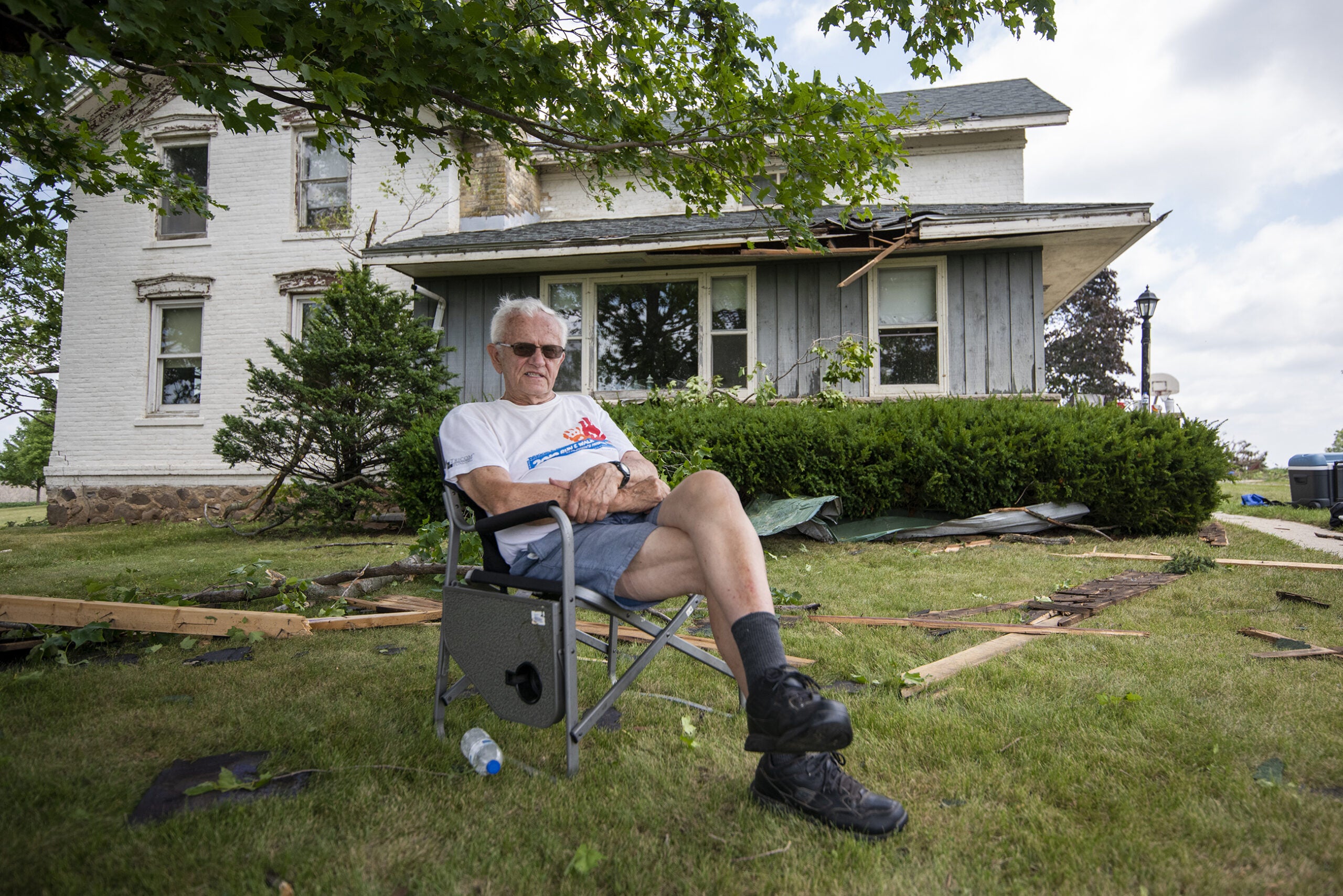 Two-thirds of his roof is missing. His apple tree is inside his neighbor’s shed. Many of his windows have been blown out and the overhang of his front porch is down.