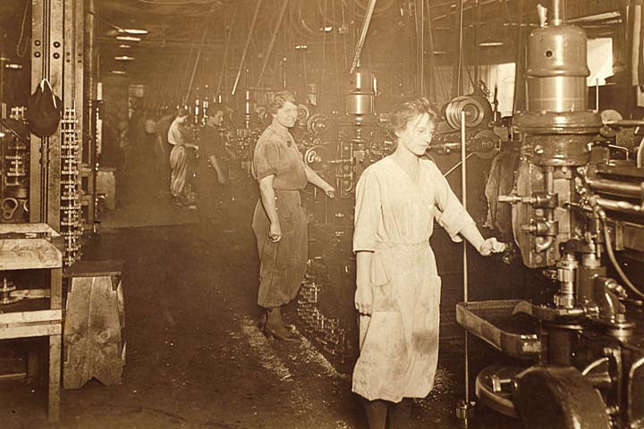 Though we tend to think of World War II as when women worked in factories, many women went to work in place of enlisted men during WWI, too, including those at Nash Motors in the image above. In fact, women already made a substantial part of the workforce even before the first world war, not to mention the farm women who had always worked in the fields.