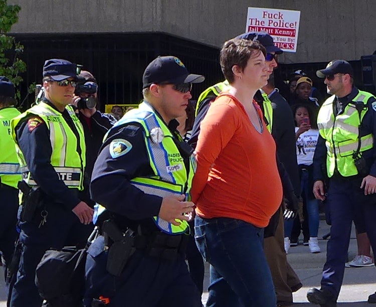 Protesters had been occupying an intersection outside the county jail for several hours, dancing and eating pizza and listening to speakers. The people who were arrested did so voluntarily, sitting down in three lines in the street and refusing police orders to leave.