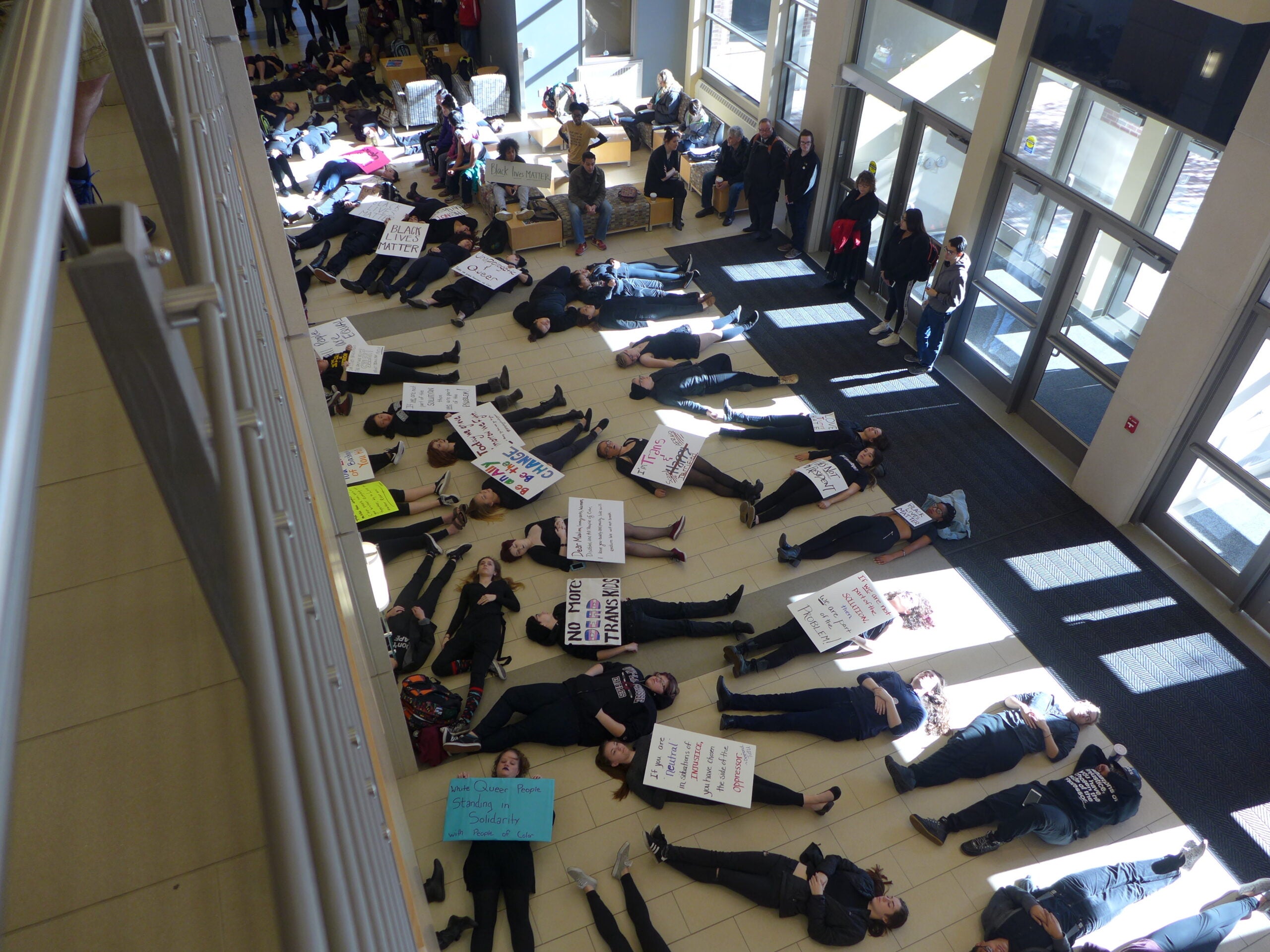 Students lay on the floor in a main campus hallway with signs criticizing President-elect Donald Trump and voicing support for people of color, the LGBT community and women.