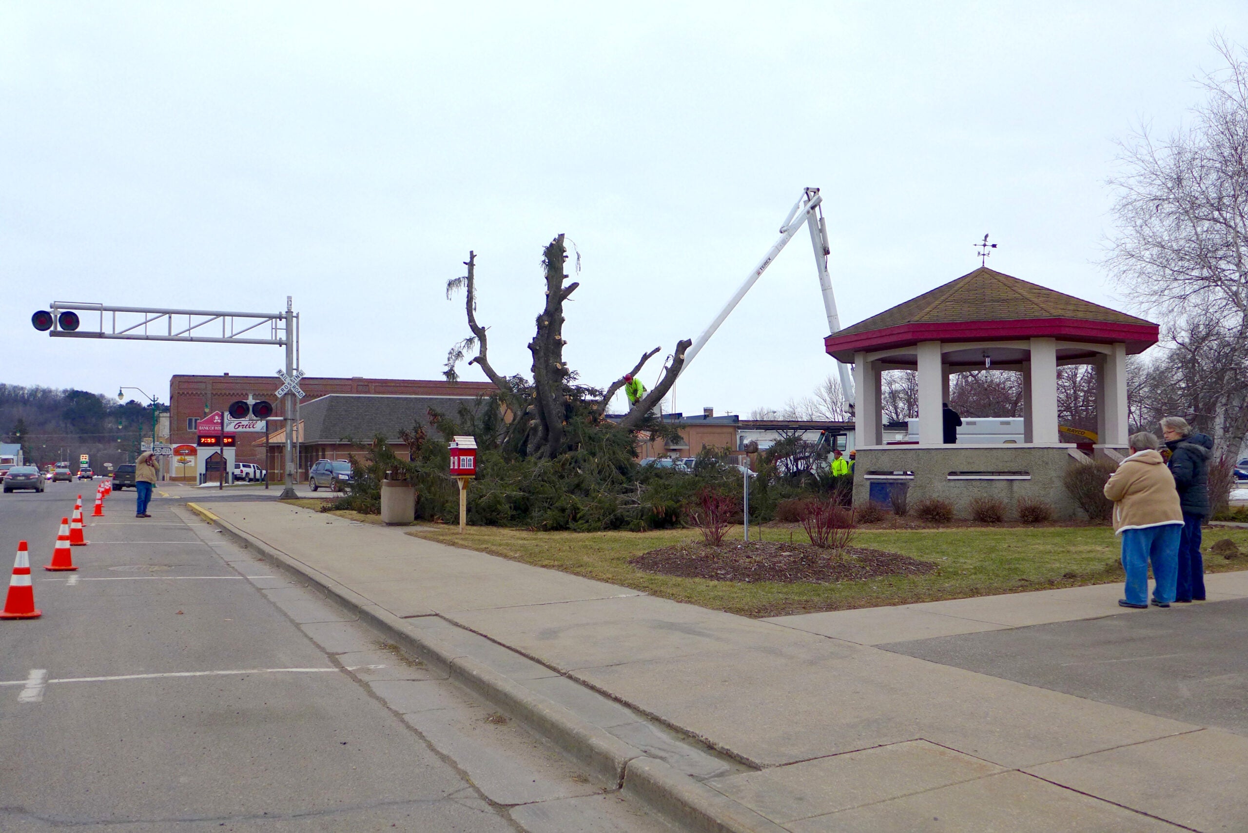 Residents of Whitehall gathered at the intersection of Highway 53 and the railroad tracks as state workers cut down the pine, which had served as the town’s annual Christmas tree. After planning began for a highway resurfacing project, officials determined last Fall that the large tree blocked the line of sight for motorists crossing the intersection. But Mary Richter, chair of the Save Our Tree Task Force said residents did not feel removing the beloved town landmark was necessary.