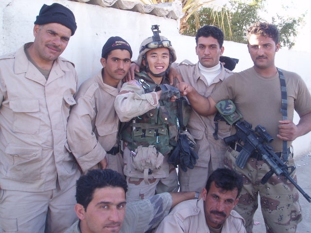 Yauo Yang (center) with a group of Iraqi soldiers that the U.S. Army Reserve would train to do security missions. :Photo courtesy of Yauo Yang
