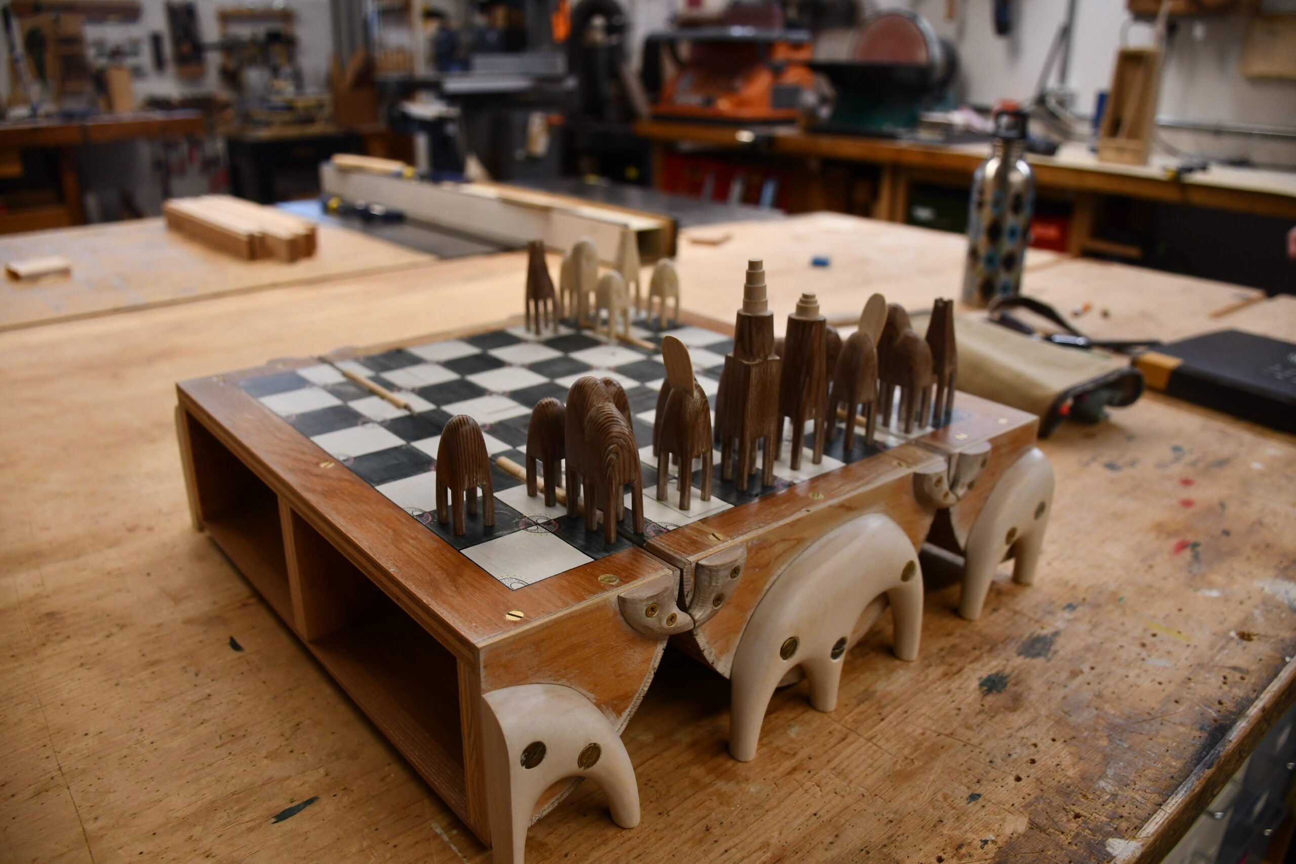 Some of Hudnall’s recent work includes a chessboard where the pieces are creatures that live in the cavity, and a cabinet with mini coffins for her dead pencils — because the pencils have drawn so many lines for her, they deserve a final resting spot, she said.