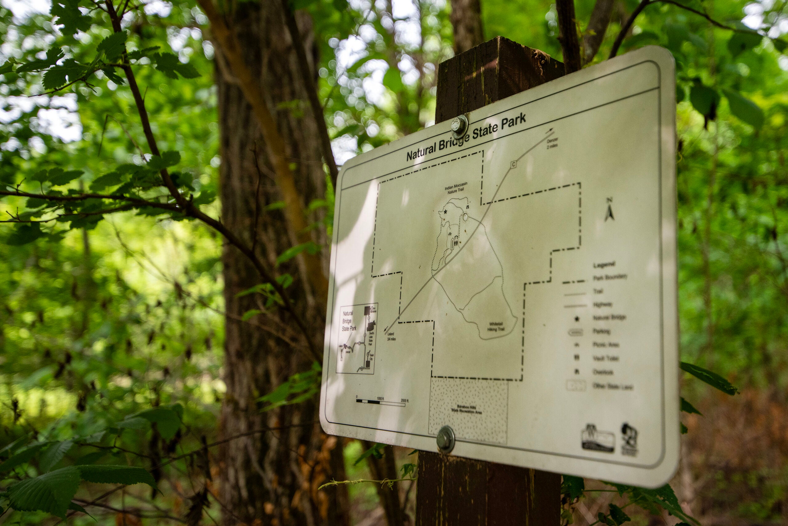 The narrow trail widens suddenly at the highlight of Natural Bridge: the titular natural bridge. A 25-foot-high sandstone arch, the largest in the state, formed over years of erosion from wind and water. A weathered sign beneath prohibits visitors from climbing onto the bridge, which drips with grasses and vines and sprouts small trees from its crags.
