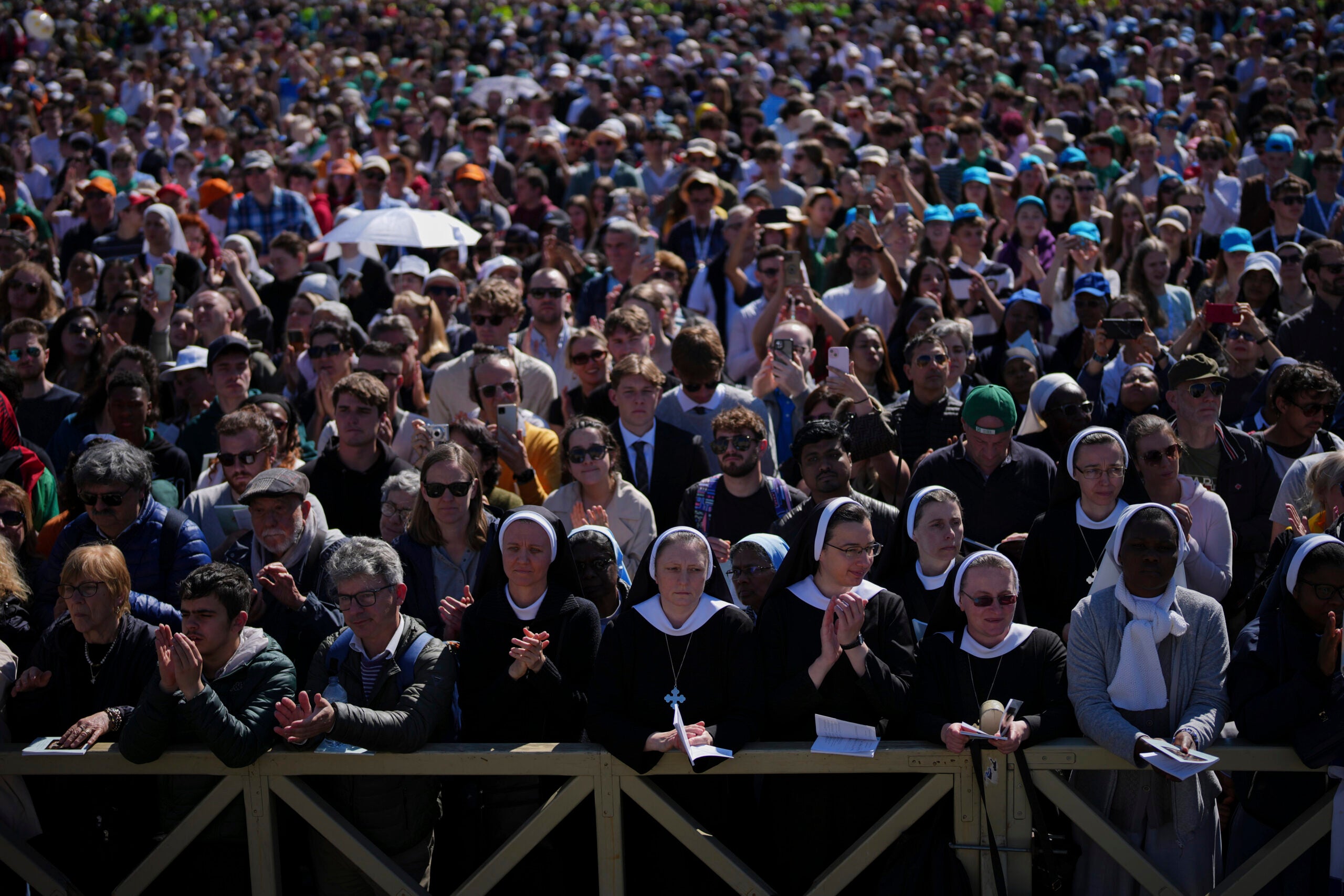 A nun waits in St. Peter’s Square as people arrive ahead of the funeral of Pope Francis at the Vatican, Saturday, April 26, 2025. (AP Photo/Andreea Alexandru)A nun holds a rosary as she waits for the funeral of Pope Francis to begin, in St. Peter’s Square at the Vatican, Saturday, April 26, 2025. (AP Photo/Emilio Morenatti)A nun looks above the crowds as people gather for the funeral of Pope Francis in St. Peter’s Square at the Vatican, Saturday, April 26, 2025. (AP Photo/Andreea Alexandru)Clergy take their seats ahead of the funeral of Pope Francis in St. Peter’s Square at the Vatican, Saturday, April 26, 2025. (AP Photo/Evan Vucci)People wait for the funeral of Pope Francis in St. Peter’s Square at the Vatican, Saturday, April 26, 2025. (AP Photo/Andreea Alexandru)People watch the funeral of Pope Francis on a monitor outside St. Mary Major Basilica in Rome Saturday, April 26, 2025. (AP Photo/Francisco Seco)The coffin of Pope Francis is carried into St Peter’s Square for his funeral, at the Vatican, Saturday, April 26, 2025. (AP Photo/Gregorio Borgia)The coffin of Pope Francis is carried into St Peter’s Square for his funeral, at the Vatican, Saturday, April 26, 2025. (AP Photo/Gregorio Borgia)The coffin of Pope Francis is laid into St. Peter’s Square during his funeral ceremony, at the Vatican, Saturday, April 26, 2025. (AP Photo/Alessandra Tarantino)Clergy during the funeral of Pope Francis in St. Peter’s Square at the Vatican, Saturday, April 26, 2025. (AP Photo/Markus Schreiber)The coffin of Pope Francis is placed on the ground during his funeral in St. Peter’s Square at the Vatican, Saturday, April 26, 2025. (AP Photo/Gregorio Borgia)Cardinals stand during the funeral of Pope Francis in St. Peter’s Square at the Vatican, Saturday, April 26, 2025. (AP Photo/Gregorio Borgia)Archbishop Diego Giovanni Ravelli, kneeling right, presides over the funeral of Pope Francis in St. Peter’s Square at the Vatican, Saturday, April 26, 2025. (AP Photo/Evan Vucci)Nuns and faithful listen to mass during the funeral of Pope Francis in St. Peter’s Square at the Vatican, Saturday, April 26, 2025. (AP Photo/Emilio Morenatti)President Donald Trump, front row right, and Ukraine’s President Volodymr Zelenskyy, front row left, are seen amongst other dignitaries during the funeral of Pope Francis in St. Peter’s Square at the Vatican, Saturday, April 26, 2025. (AP Photo/Gregorio Borgia)A view of the funeral of Pope Francis in St. Peter’s Square at the Vatican, Saturday, April 26, 2025. (AP Photo/Alessandra Tarantino)Nuns attend the funeral of Pope Francis in St. Peter’s Square at the Vatican, Saturday, April 26, 2025. (AP Photo/Andreea Alexandru)The book of the Gospels lies on the coffin of Pope Francis during his funeral ceremony in St. Peter’s Square at the Vatican, Saturday, April 26, 2025. (AP Photo/Alessandra Tarantino)