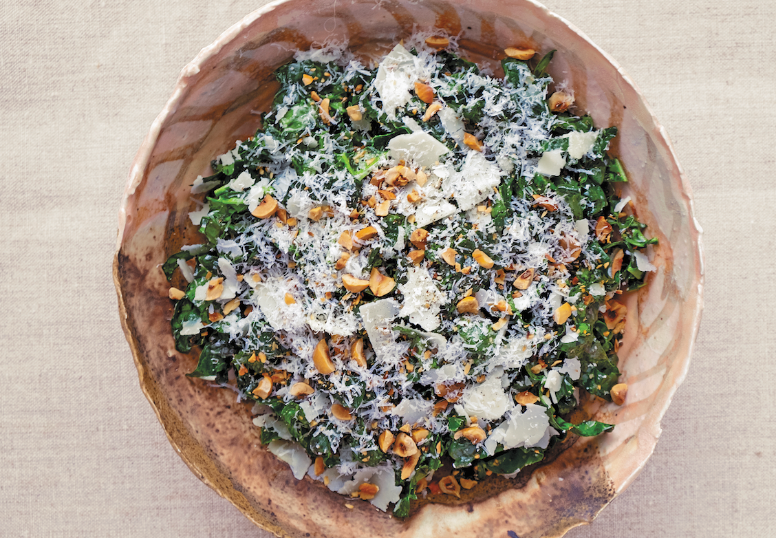 When you are ready to serve, toss the kale with most of the cheese and most of the hazelnuts and garnish with the rest. Finish with freshly ground black pepper and serve.