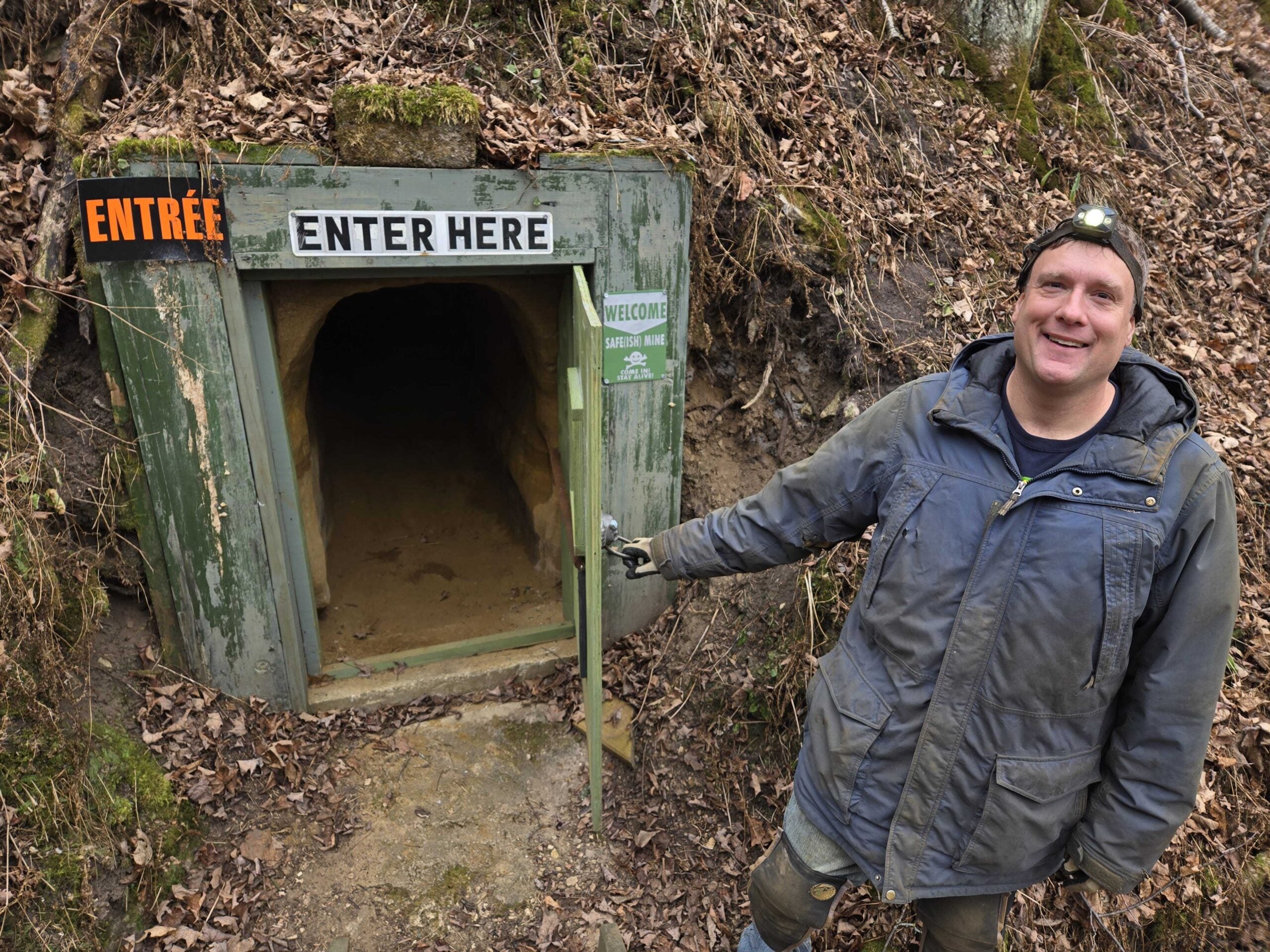 The intended entrance to Sandland is only about three feet tall. The only way through here is to crawl. The only light in the tunnels comes from our headlamps.