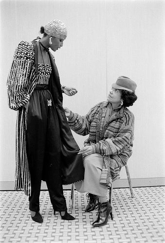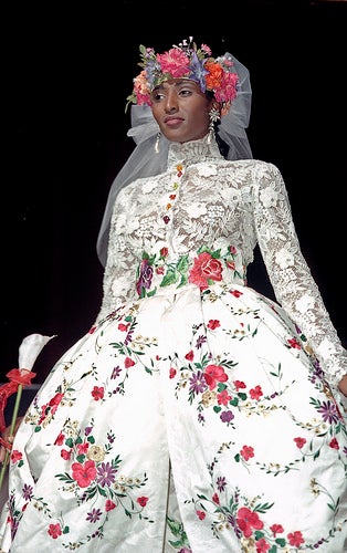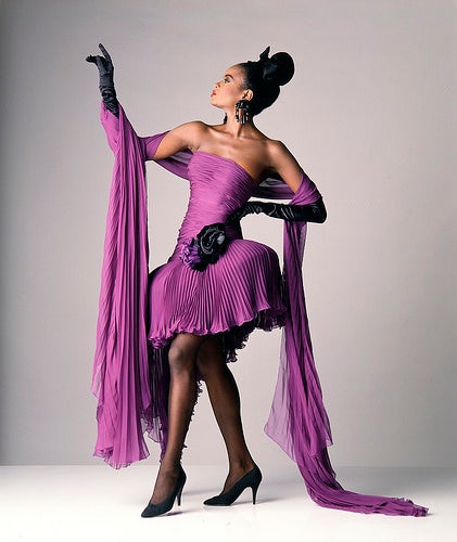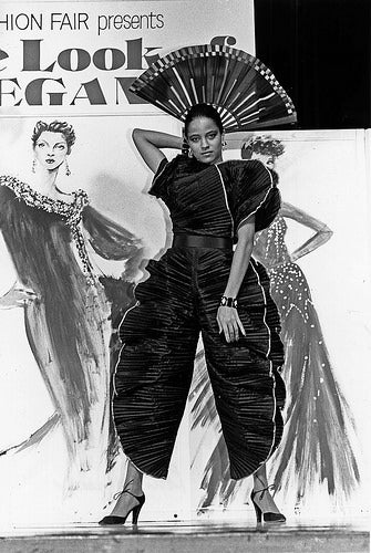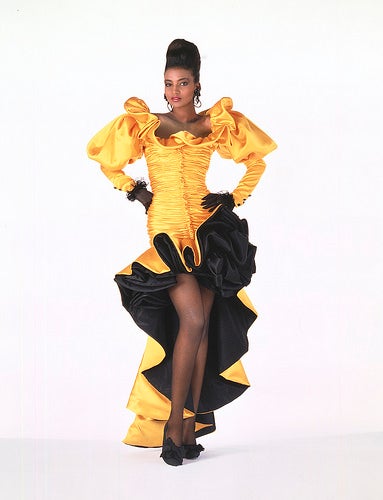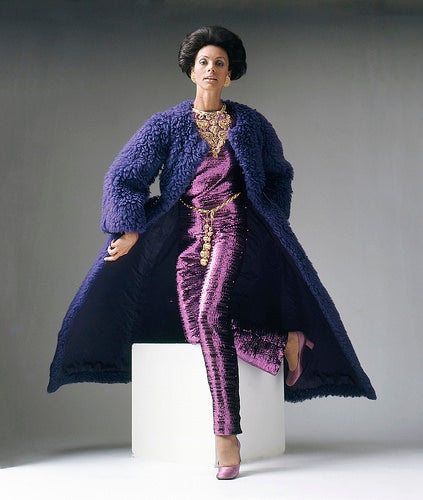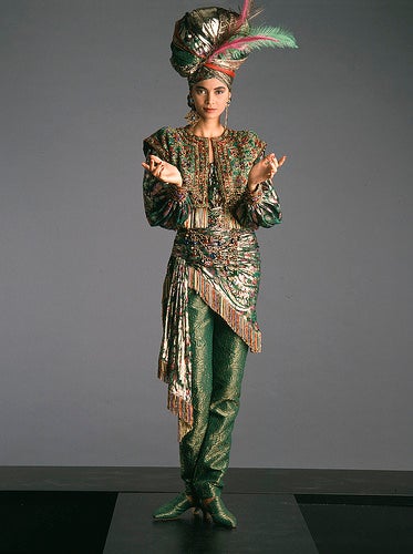 Silk and metallic thread jacquard, glass beads and rhinestones, metallic fringe, plastic sequins Lent by Johnson Publishing Company, LLC