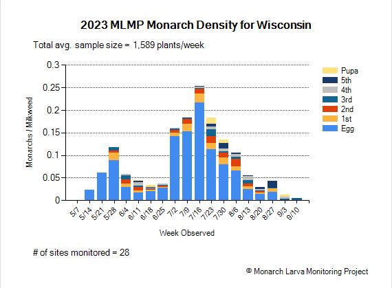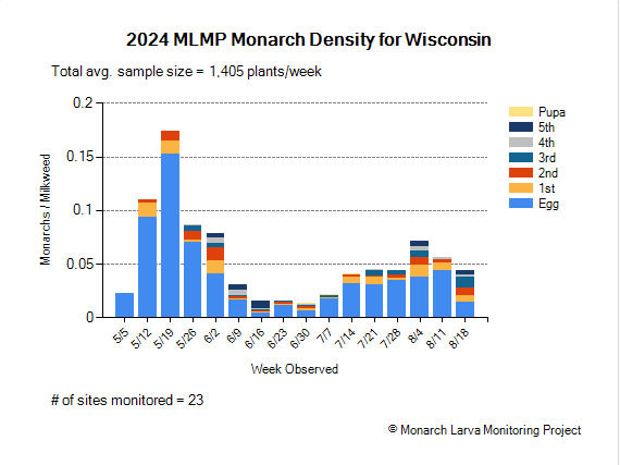 Generally, as was the case in 2023, Wisconsin volunteers saw increased numbers of monarchs per milkweed in the summer.
