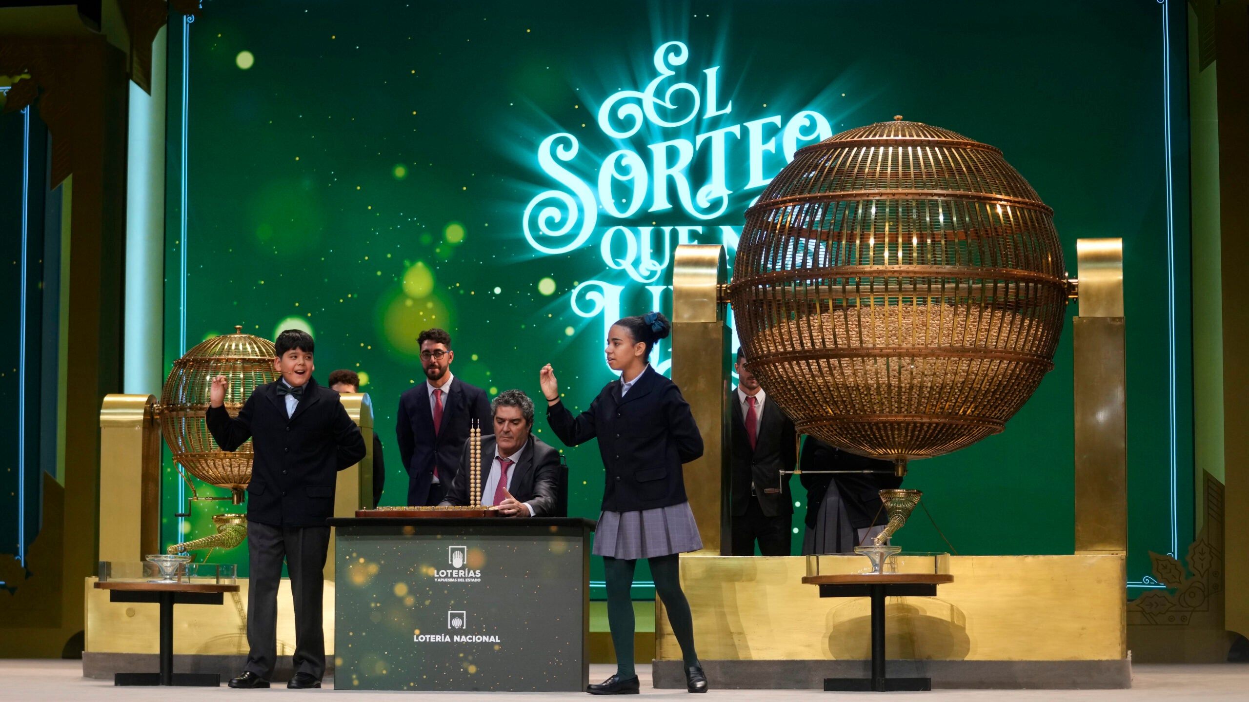 The winning numbers were called out by children from Madrid’s San Ildefonso school. The children picked up balls showing ticket numbers and their corresponding prizes from two giant rolling drums. They sang out both figures with a rhythmic cadence that is known to everyone in Spain.