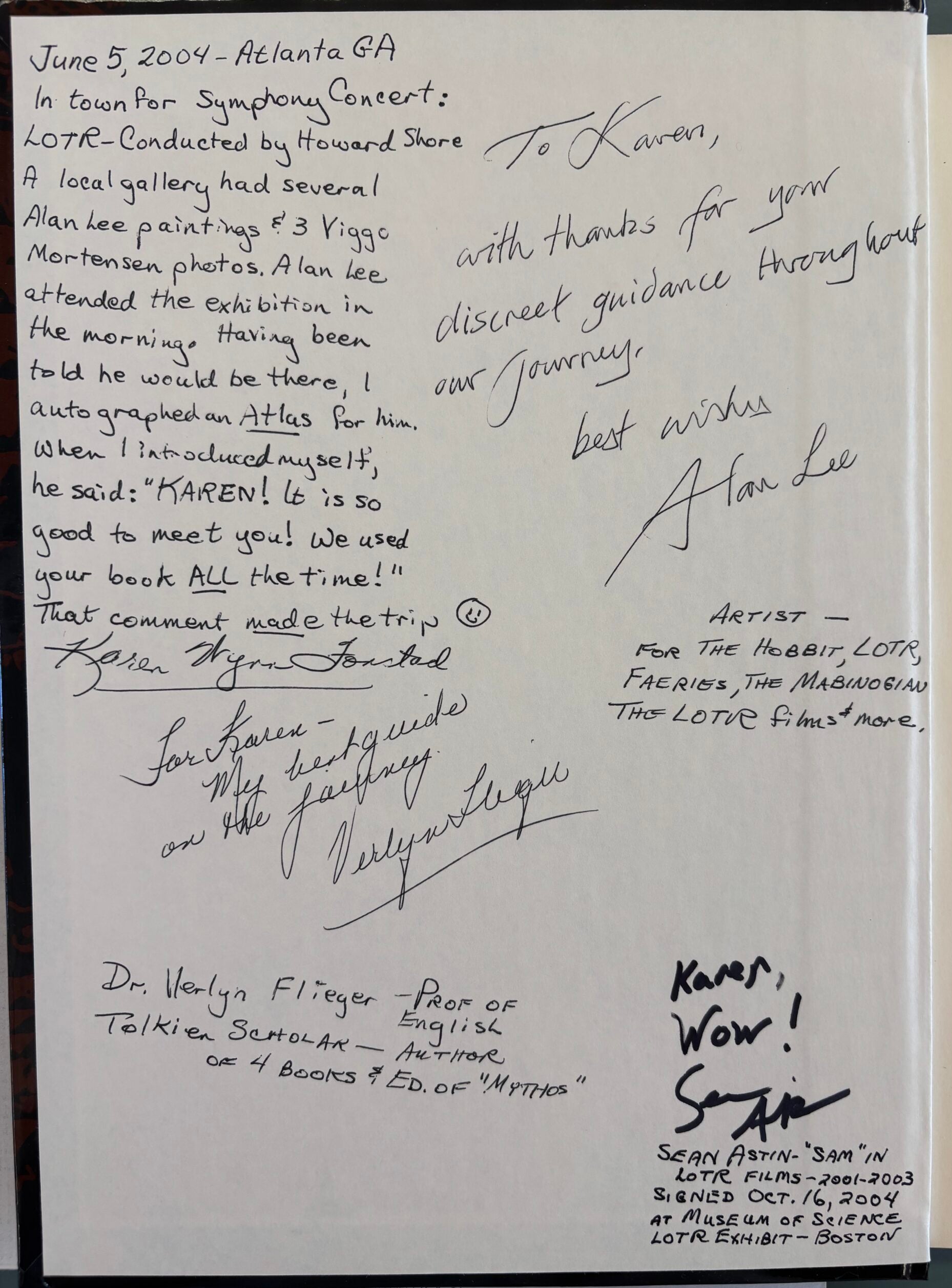 Those movies are part of her legacy, as the creative team behind the movie used her maps for guidance and inspiration. Alan Lee, one of the lead concept artists for Peter Jackson’s “The Lord of the Rings” films, signed Karen’s copy of the atlas: “With thanks for your discreet guidance throughout our journey.”