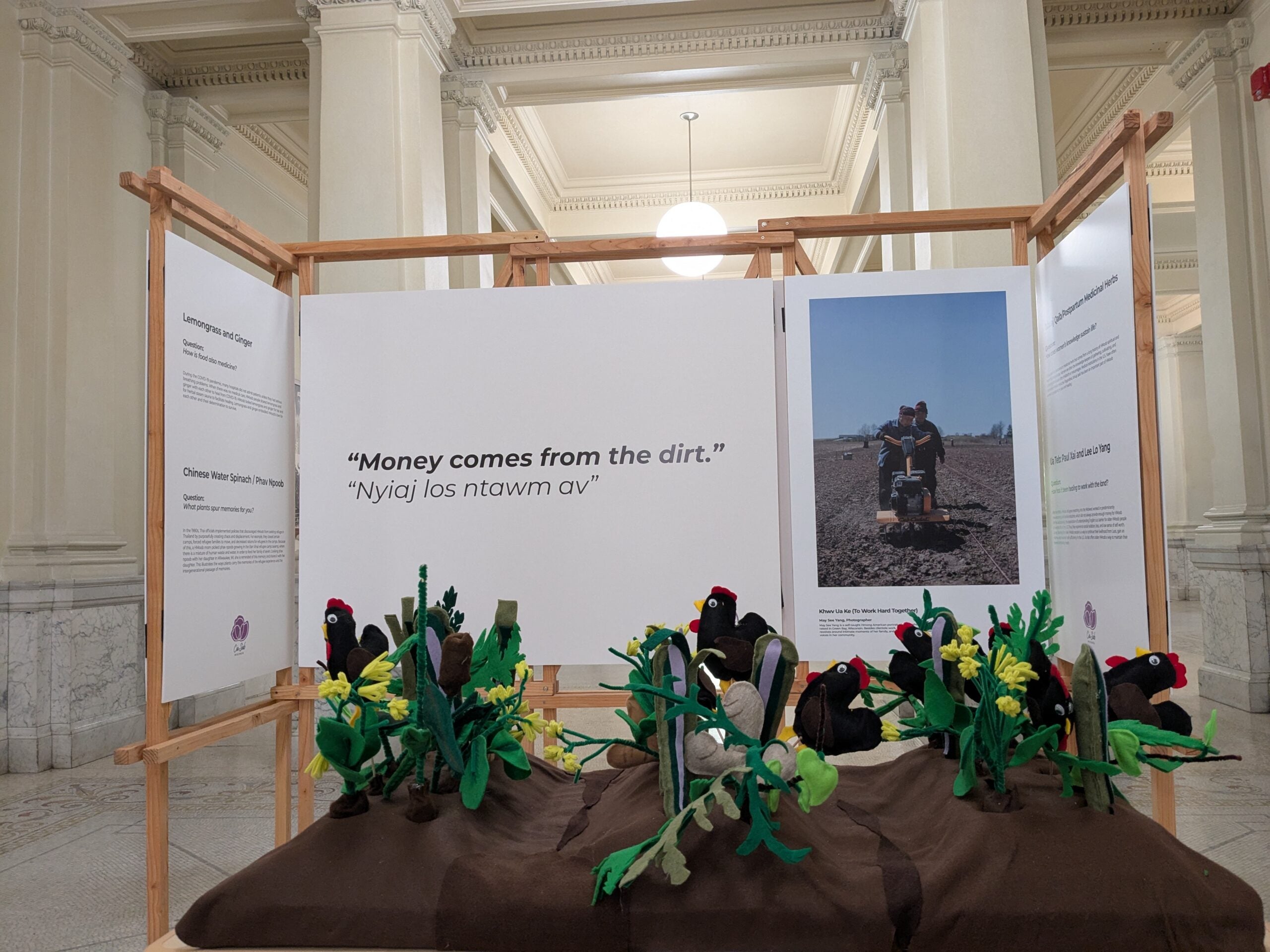 Near the front of the display is a garden area with information about ginger and lemongrass — vegetables important to Hmong cuisine — and images of Hmong farmers, including a portrait of Wisconsin-based Hmong photographer May See Yang’s father. An interactive craft garden made of felt has been popular with kids, according to historical society Public Programs Manager Jenny Pederson.