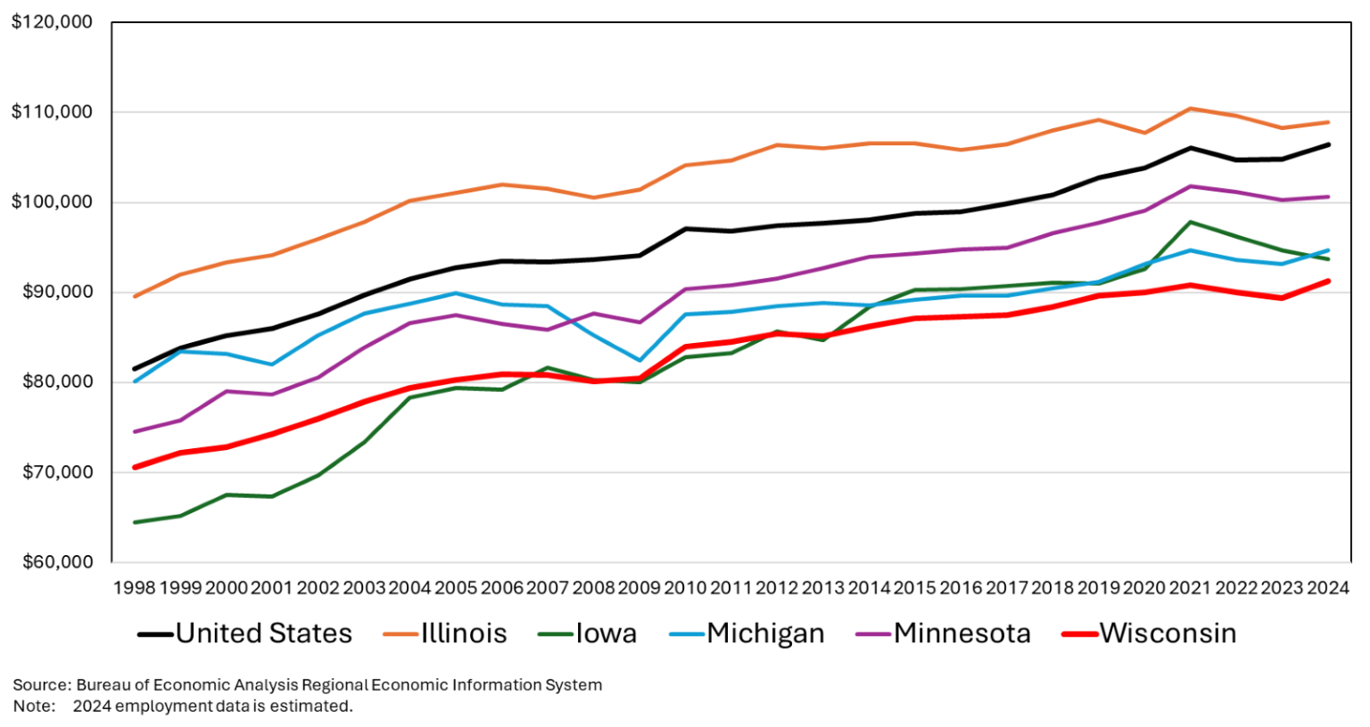 It found Wisconsin’s GDP per worker has generally lagged behind Illinois, Iowa, Michigan and Minnesota since the mid-2010s — and the average output per worker in the Badger State fell between 2021 and 2023.