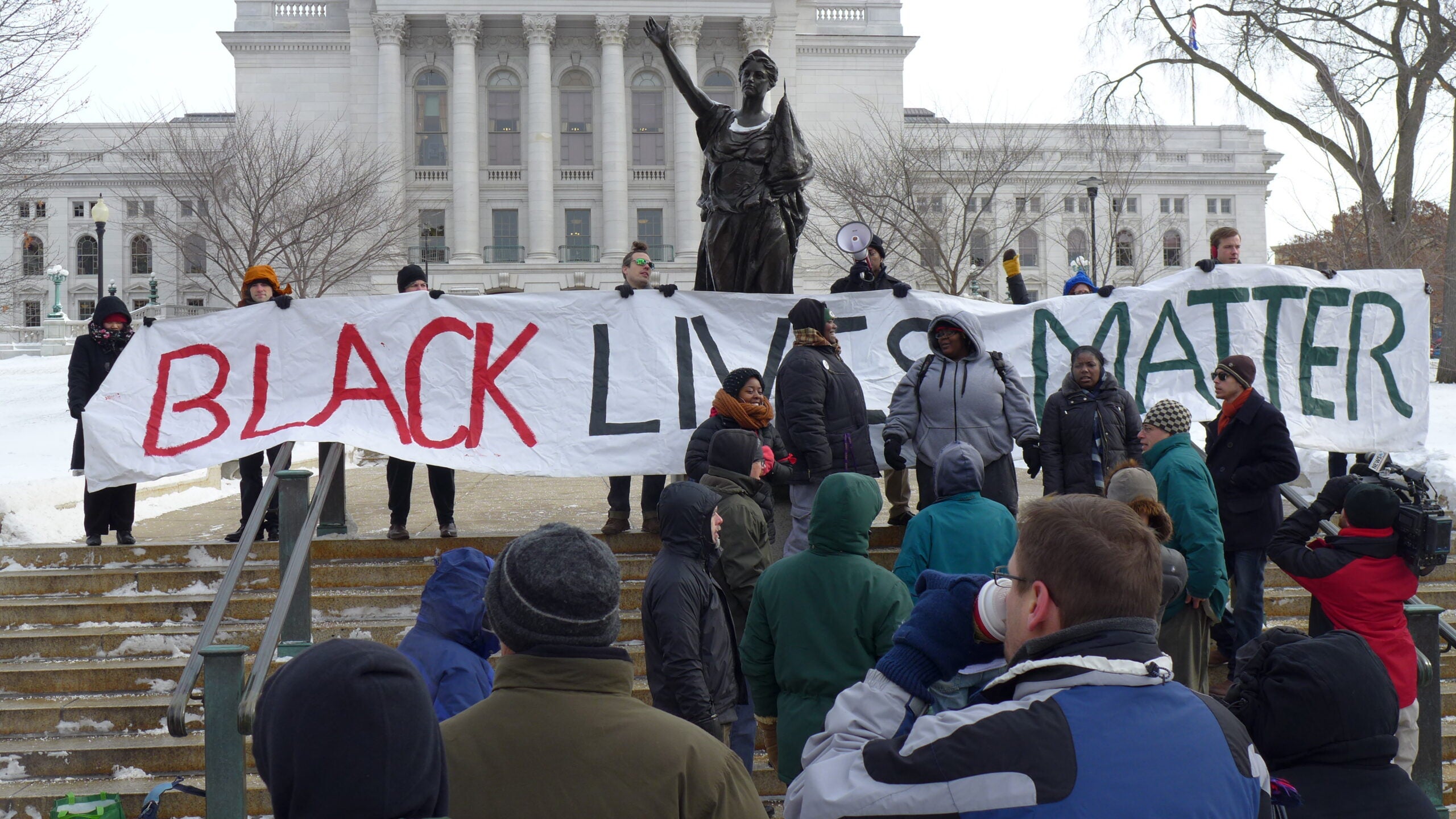 A group of about 50 protesters in the middle of Martin Luther King Jr. Boulevard blocked traffic while holding a banner that read “Black Lives Matter” before marching around the Capitol Square. Organizer Brandi Grayson said the group believes Gov. Scott Walker’s policies are contributing to poverty and violence in poor black communities.