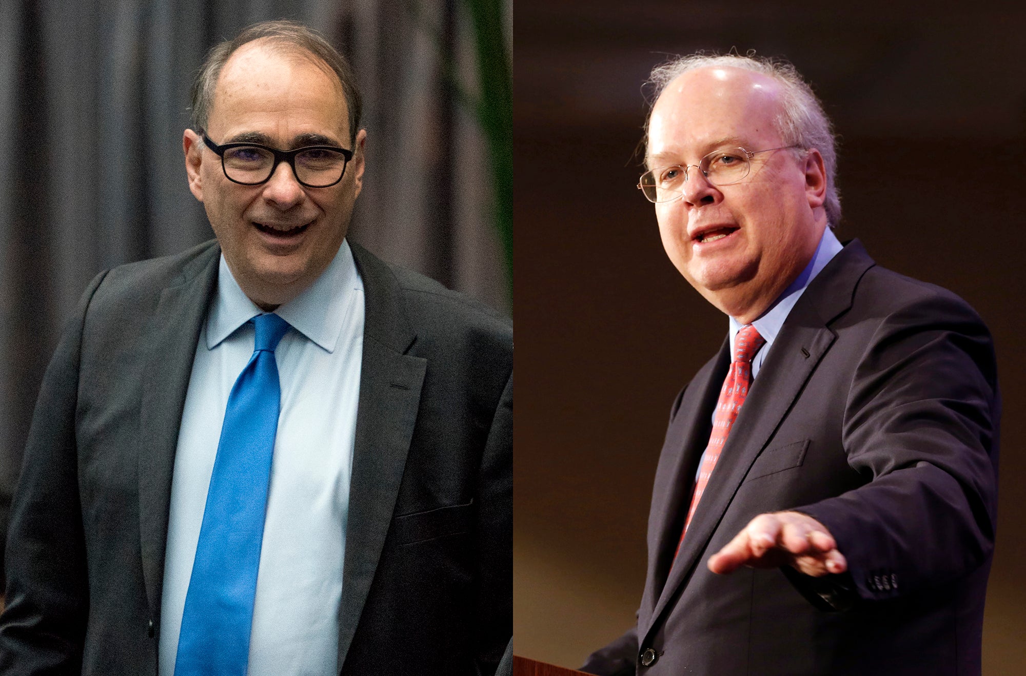 Karl Rove was a senior advisor and chief of staff for former President George W. Bush. David Axelrod was a chief strategist for former President Barack Obama.