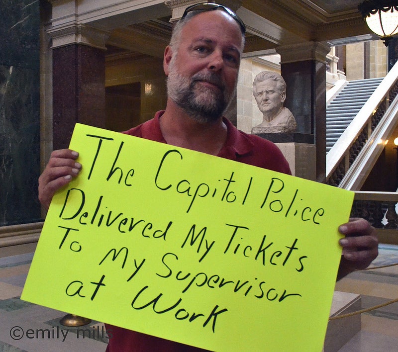 State capitol police have started ticketing protesters at their homes and workplaces for holding signs without a permit in the capitol rotunda.