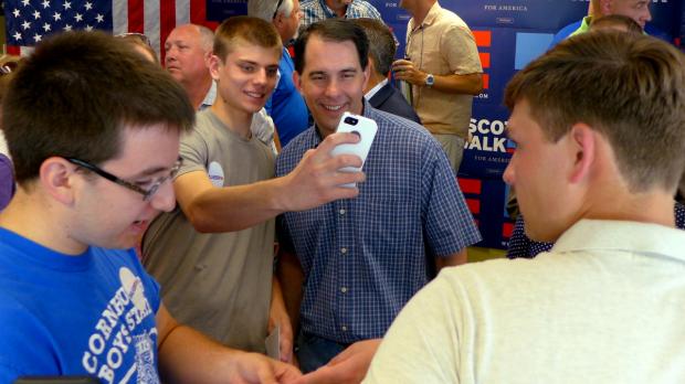 The Wisconsin governor was in Council Bluffs, Iowa at a Hy-Vee grocery store in a small-ish conference room — too small for the standing-room-only crowd. People fanned themselves to stay cool as Walker began to speak.