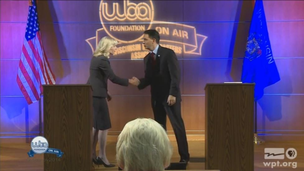 Mary Burke and Gov. Scott Walker shake hands after their first debate on Oct. 10, 2014.  Photo: Wisconsin Public Television.
