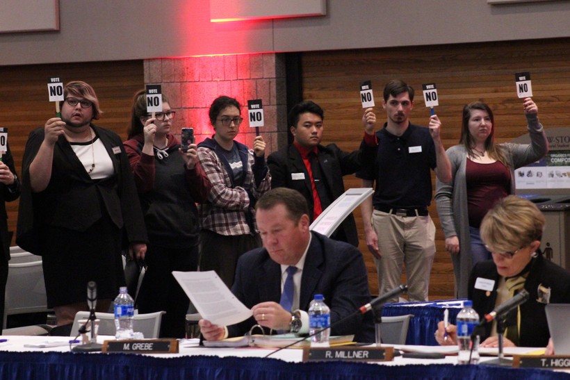 As regents debated the freedom of expression resolution close to 20 students from UW-Stout stood from their chairs holding signs that said "Vote No." Among them was senior Derek Brown who worried that punishing students who oppose extreme rhetoric could actually draw purveyors of hate speech to UW campuses.