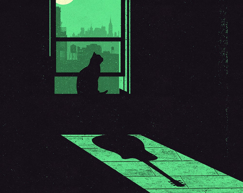 illustration of cat in moonlit window casting a guitar shadow