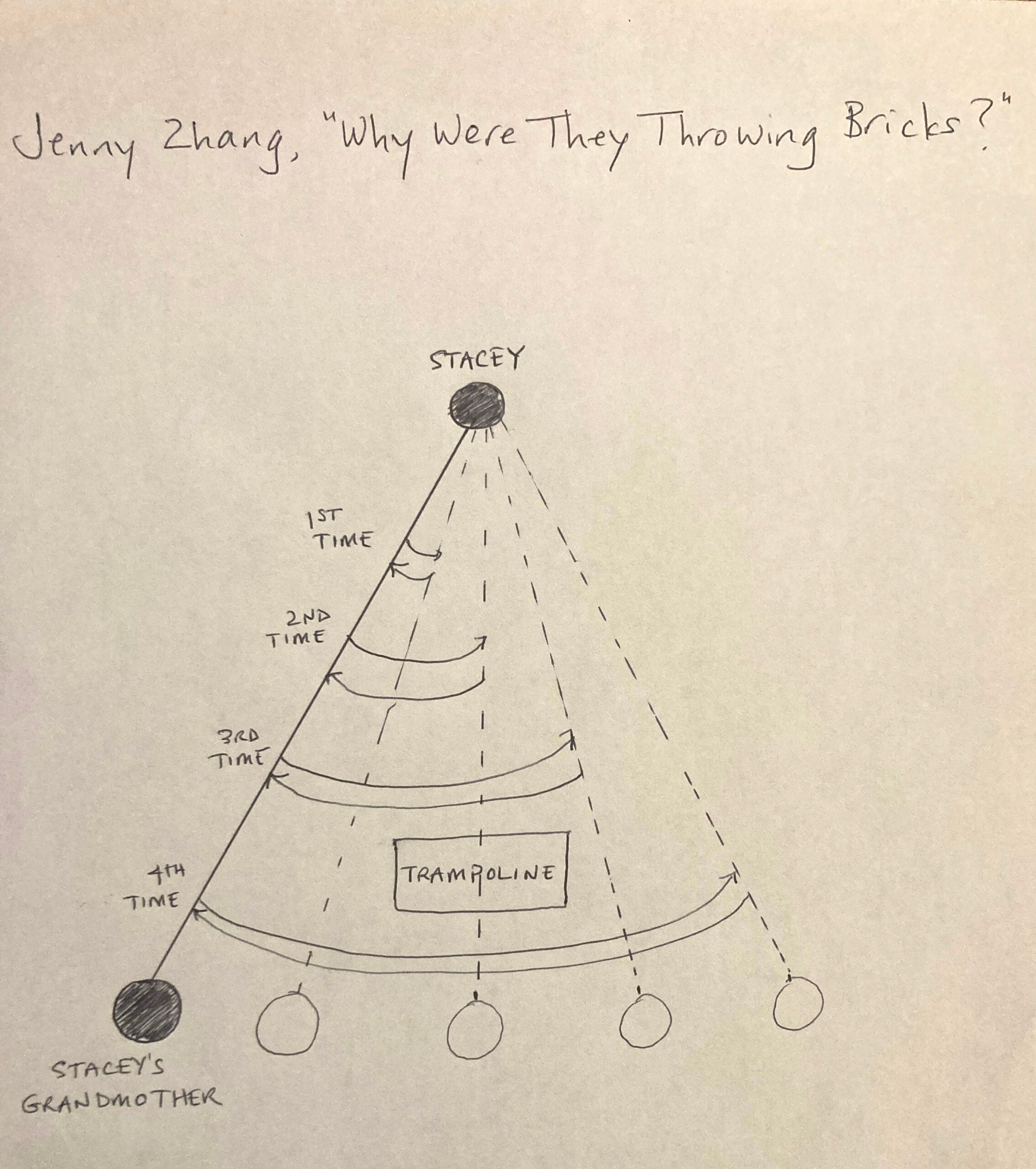 Story map of Jenny Zhang’s “Why Were They Throwing Bricks,” by author Alix Ohlin. Drawing courtesy of Alix Ohlin When Ohlin reads stories she admires, she often finds it helpful to map their forms visually.