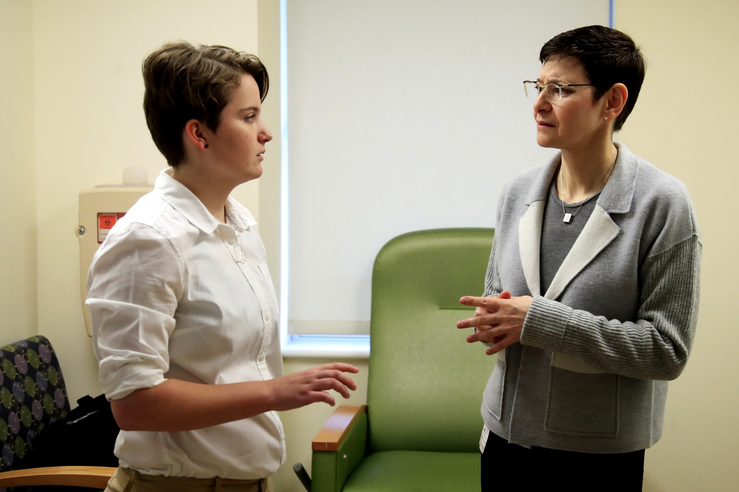 Julia Finkel, Associate Chief of Anesthesiology at Children’s National Medical Center in Washington, talks to her patient Sarah Taylor during a consultation, Monday, Dec. 10, 2018. Children’s National Medical Center is testing an experimental device that aims to measure pain according to how pupils react to certain stimuli. “If we can’t measure pain, we can’t fix it,” said Finkel, who invented the eye-tracking device. (Manuel Balce Ceneta/AP Photo)