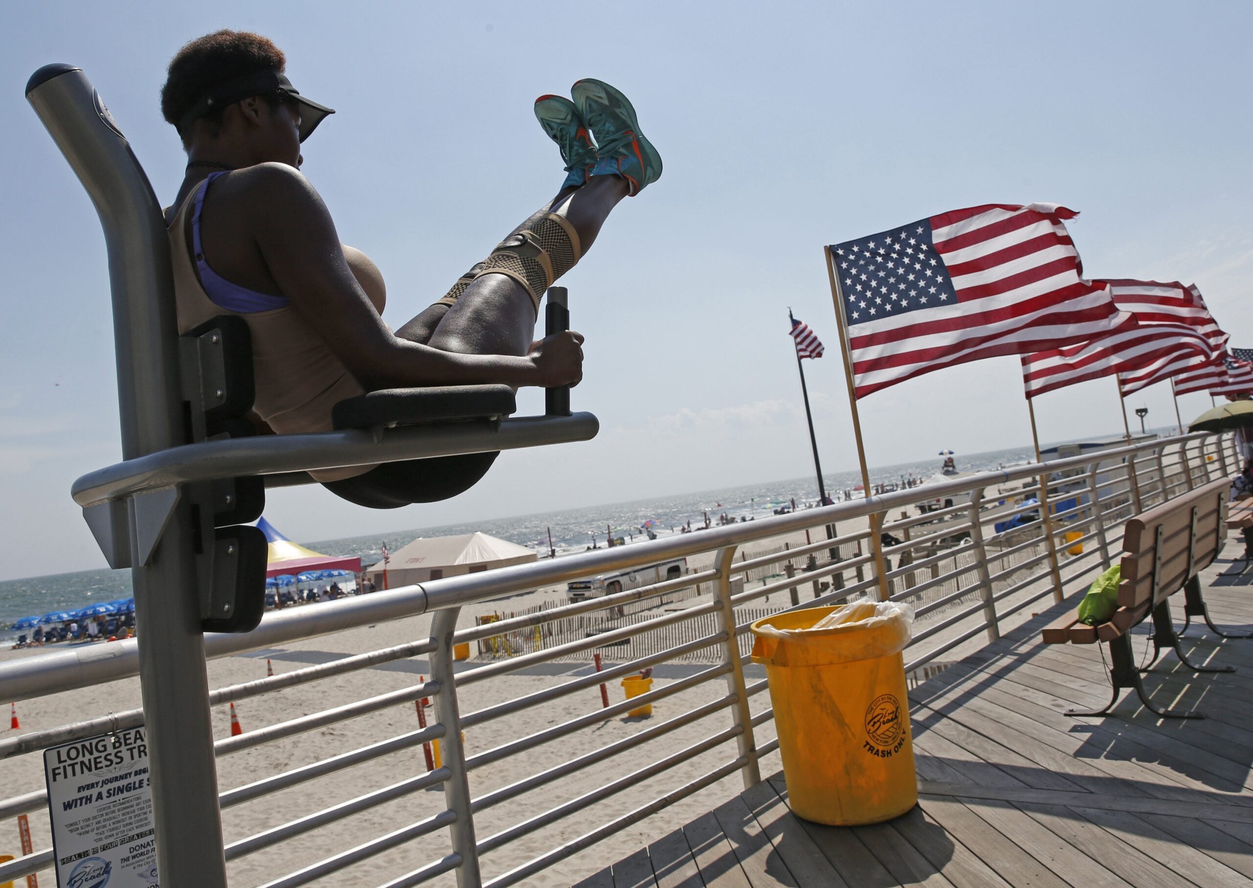 Karma Scott, 19, does leg lifts at a fitness station on the boardwalk, Wednesday, July 19, 2017, in Long Beach, N.Y. Temperatures in the 90’s drew hundreds of people seeking relief from the warmth to the ocean where stiff breezes cooled them off. Scott said she exercises regularly after trimming down from 250 pounds in about a year and a half. (AP Photo/Kathy Willens)
