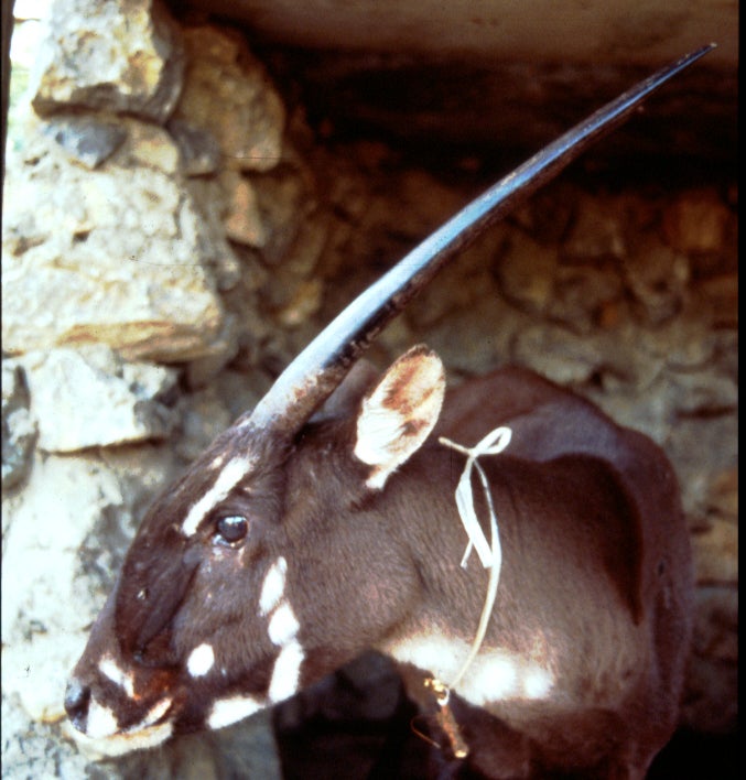 “It has very long horns, sometimes more than 2 feet long and (a) beautiful pattern of white spots on the face,” said Bill Robichaud, program coordinator for the Global Wildlife Conservation’s Saola Conservation Program. “They are about the size of a white-tailed deer.”