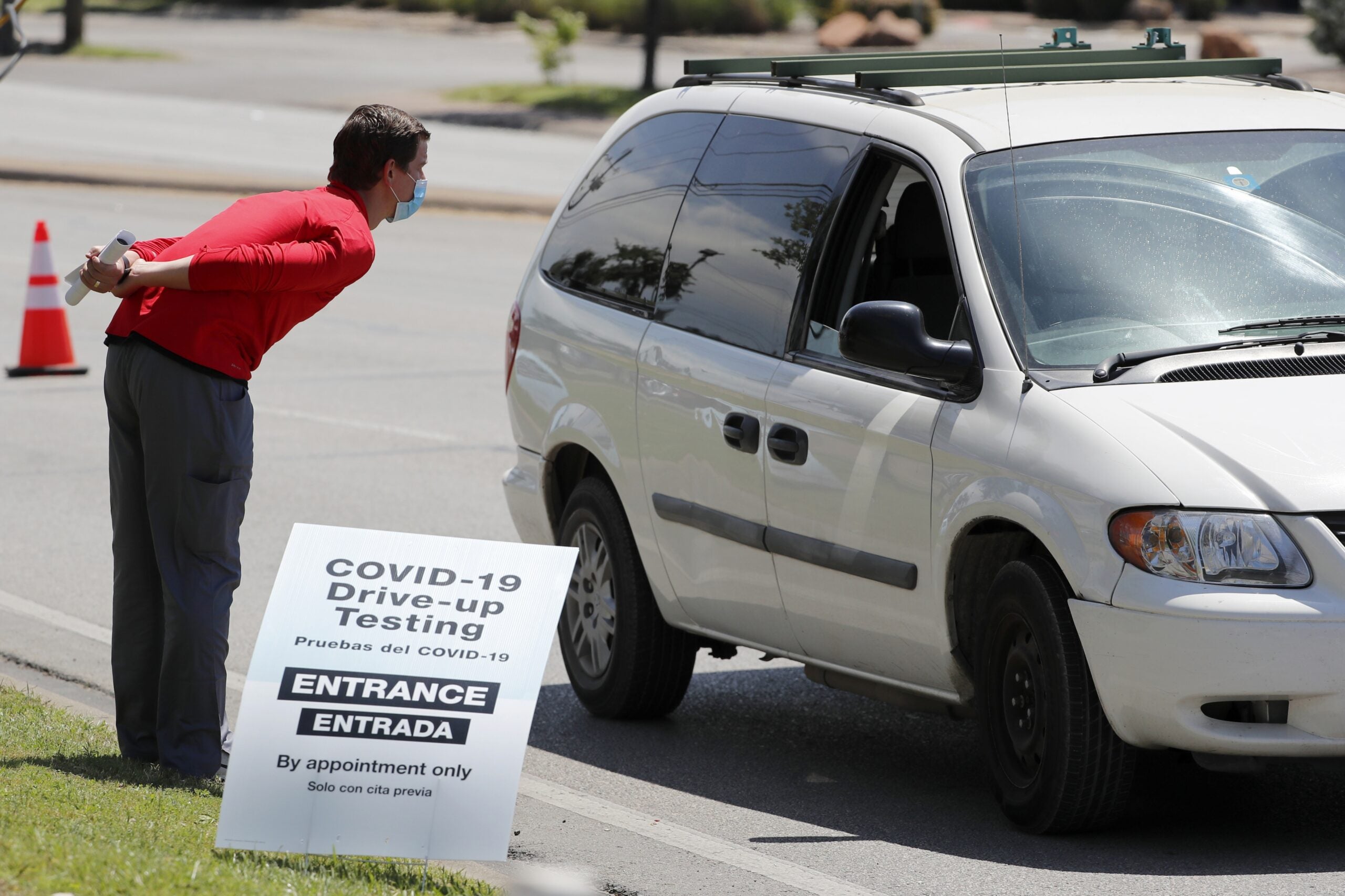 A Walgreens employee talks with a person in line for COVID-19 testing in Dallas, Saturday April 25, 2020. The location began testing for the new coronavirus on Friday with a drive-through process and is provided to eligible individuals at no cost. Persons wanting to be tested are asked to go online to their website to determine their eligibility. The nasal swab test is self administered with directions from a store pharmacist. (AP Photo/Tony Gutierrez)