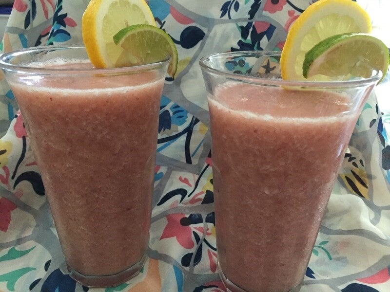 Two glasses with lemon and lime wedges on the rim serving Midwestern Rhubarb Margaritas.