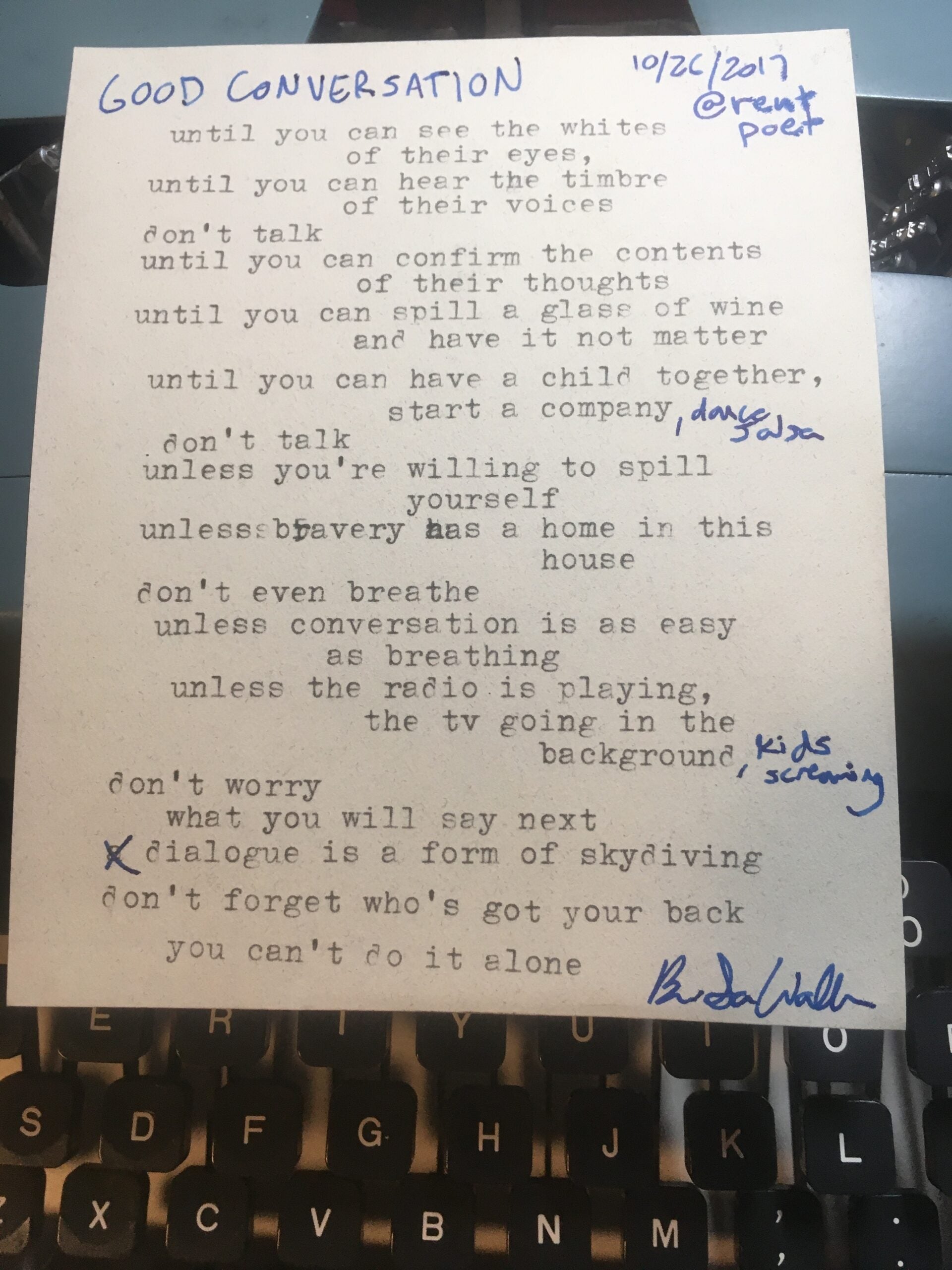 One writer says poetry is not solely a high literary art; he says it’s a service. Our guest Brian Sonia-Wallace recently set up his typewriter at the nation’s largest mall to write poems for strangers. He wants people to consider poetry a currency, and he discusses his mission to make poetry accessible to all people.