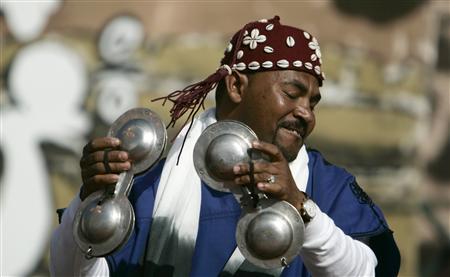 Musician in traditional Moroccan attire and playing a pair of metal castanets called Qarkabeb.
