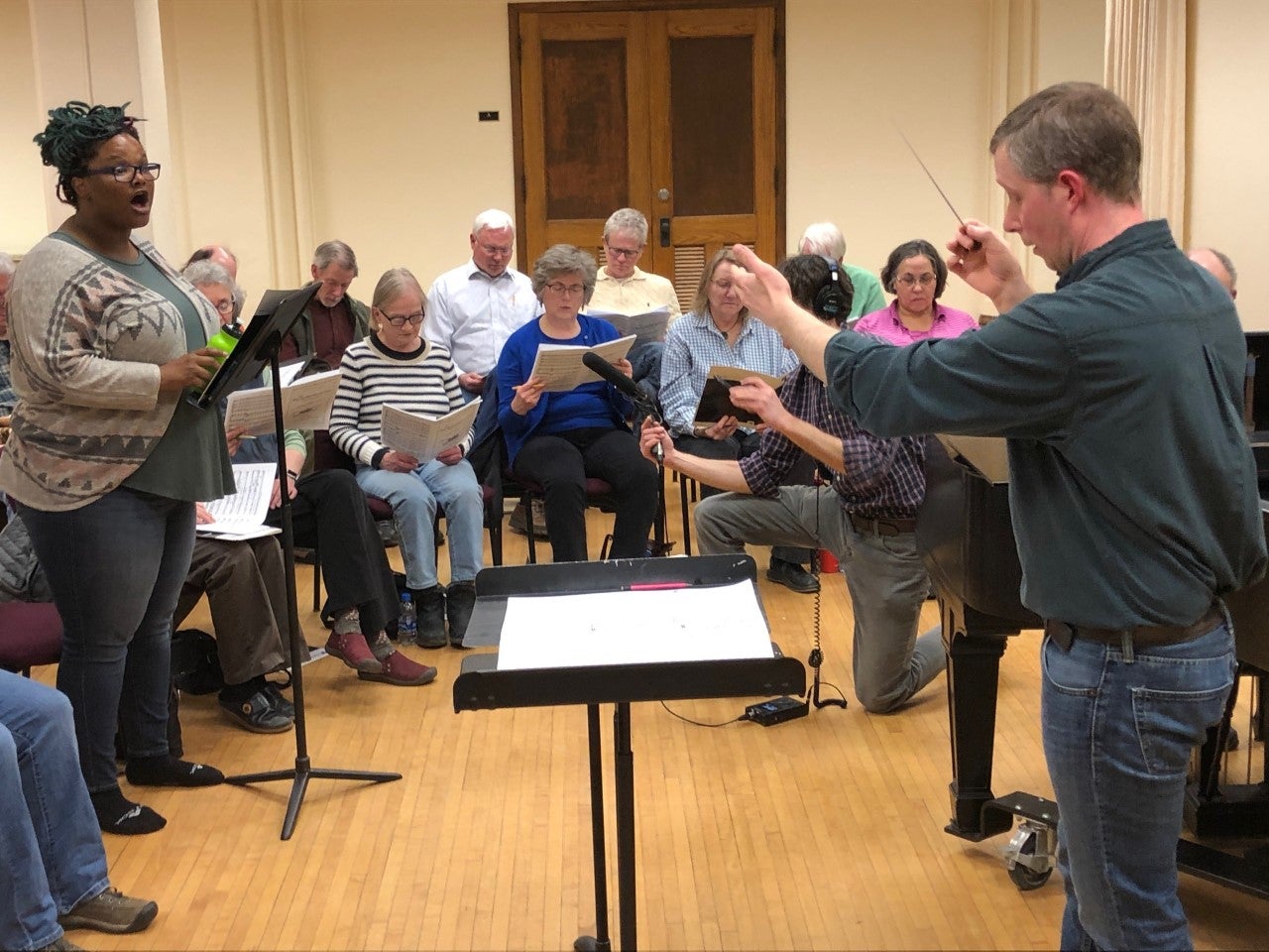 Soloist Diona Johnson and conductor Josh Aerie rehearse a section from William Grant Still’s oratorio, “And They Lynched Him on a Tree,” at the College of St. Scholastica in Duluth this week. The work, along with Still’s Second Symphony and the premiere of “We Three Kings” by Duluth composer Rudy Perrault will be performed as the Clayton Jackson McGhie Memorial Concert on Sunday, March 8, at 2 p.m. at St. Scholastica ‘s Mitchell Auditorium. Aerie, Perrault and concert organizer Julia Cheng sat down with Simply Superior host Robin Washington to discuss the music and the history behind it.